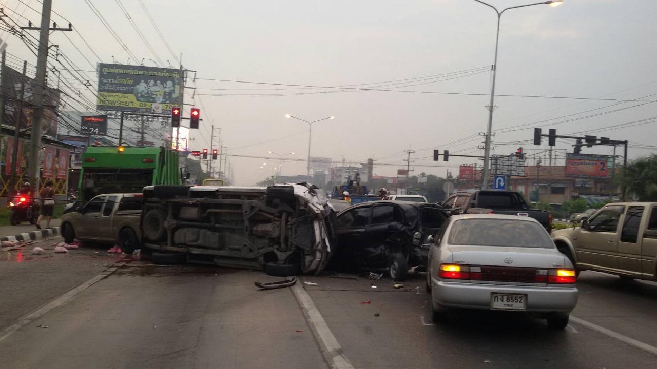 ที่เกิดเหตุพบคันที่ 1 เป็นรถ 6 ล้อเก็บขยะสีเขียวเทศบาลเมืองสามพราน ทะเบียน 83-4359 กทม. คันที่ 2 รถกระบะอีซูซุ สีทองทอง ทะเบียน ปษ5574 กทม. คันที่ 3 รถเก๋ง สีดำทะเบียน 5กฉ5992 กทม. คันที่ 4 รถเก๋งฮอนด้าบริโอ สีดำทะเบียน กธ 4718 นครปฐม สภาพพังยับเยิน ของ พญ.ธารารัตน์ สมมิตร อายุ 26 ต.คลองใหม่ อ.สามพราน จ.นครปฐม เป็นแพทย์ ประจำอยู่ รพ.สามพราน คันที่ 5 รถเก๋งโตโยต้าสีเทาทะเบียน กง8552 ราชบุรี คันที่ 6 รถกระบะ อีซูซุดีแมคซ์ สีบรอนซ์ ทะเบียน ผค 1259 นครปฐมมีนายมณฑล วงษ์จดศรี อายุ 54 ปี ต.พระปฐมเจดีย์ อ.เมือง จ.นครปฐม เป็นคนขับสภาพคว่ำพลิกตะแคง ชนติดอยู่กับรถคู่กรณี หมูเนื้อแดงสดที่บรรทุกมาน้ำหนักกว่า 2 ตัน กระเด็นเกลื่อนถนน รถขวางไป 3 ช่องทางการจราจรไป 3 เลน เจ้าหน้าที่ตำรวจ ต้องเร่งระบายการจราจร แยกรถ ออกข้างทาง และช่วยกันขนย้ายถุงใส่หมูเนื้อแดงเข้าข้างทาง เนื่องจาก รถติดจำนวนมาก อุบัติเหตุในครั้งนี้โชคดีไม่มีผู้ได้รับบาดเจ็บ
