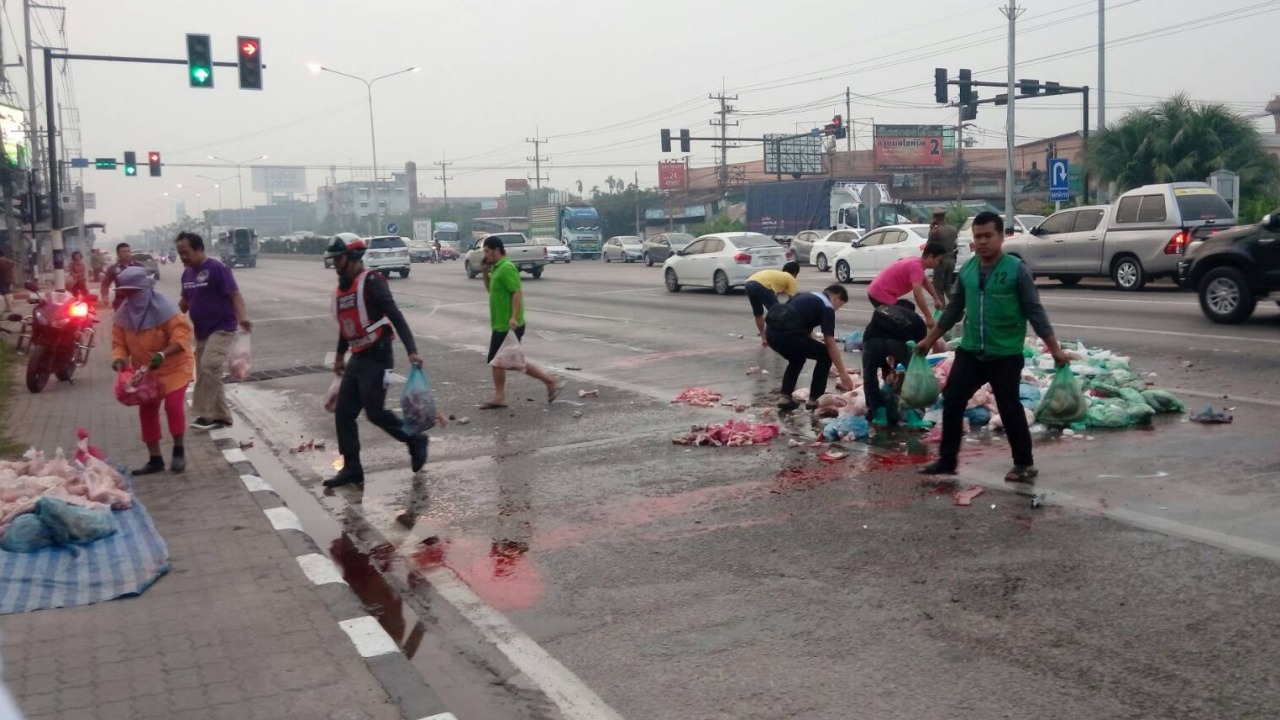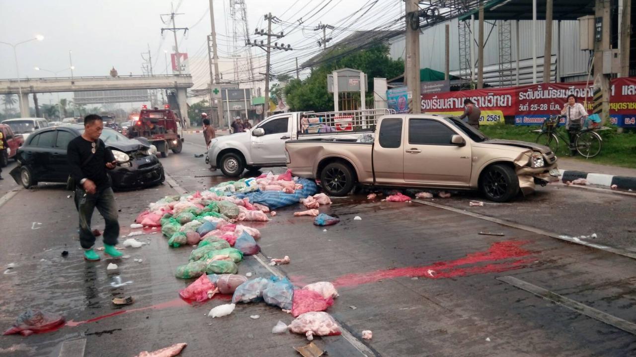 รถกระบะบรรทุกหมูเนื้อแดงสดมาเต็มคันรถ เกิดเบรกแตกชนรถติดไฟแดงที่แยกสามพราน บนถนนเพชรเกษม ขาเข้า กทม. 6 คันรวด เนื้อหมูกระจายเกลื่อนถนน ชาวบ้านต้องช่วยเก็บ โชคดีไร้คนบาดเจ็บหนัก...
