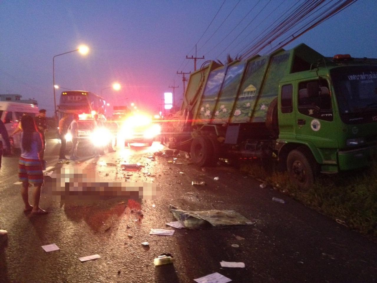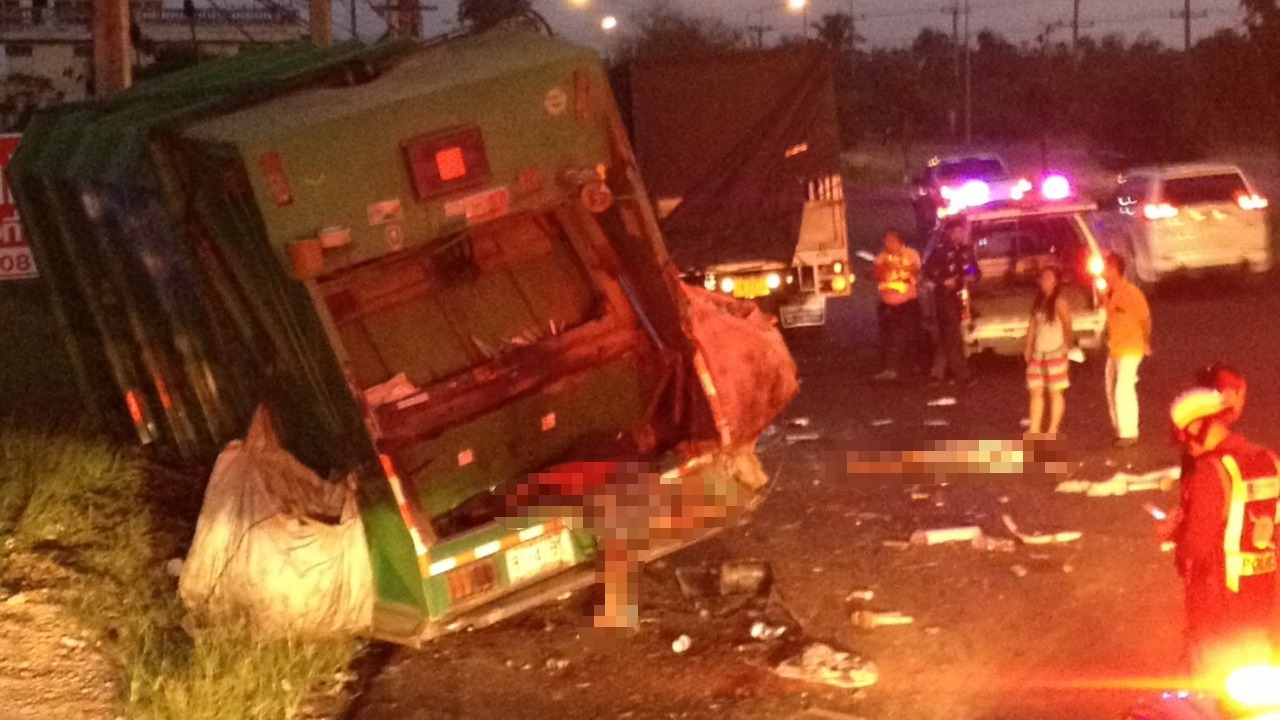 ดวงซวยจริงๆ! คนงานเทศบาลตำบลไร่เก่า ชะตาขาด ถูกรถหกล้อหลับในพุ่งชนขณะโกยขยะใส่รถ ส่วนหกล้อคนนั่งข้างไม่คาดเข็มขัด ร่างทะลุกระจกออกนอกรถตายสยองเป็นศพที่ 2...