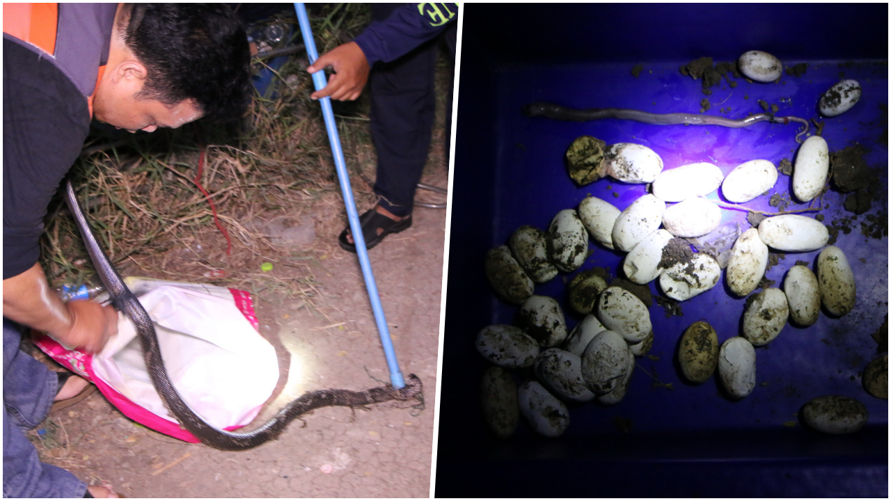 เมื่อเวลา 18.00 น. วันที่ 22 มี.ค. ผู้สื่อข่าวรายงานว่า หน่วยกู้ภัยฉะเชิงเทรา พร้อมอุปกรณ์จับงู ตรวจสอบที่บ้านริมบ่อปลาไม่มีเลขที่ หมู่9 ต.บางวัว อ.บางปะกง จ.ฉะเชิงเทรา หลังรับแจ้งจากนายสมชาย เชียงนาง อายุ 52 ปี แจ้งว่า พบงูเห่า และไข่จำนวนมาก จึงรีบเดินทางไปตรวจสอบพบที่เกิดเหตุอยู่บริเวณทางเดินใกล้กันบ้านที่ปลูกไว้ริมบ่อปลา โดยนายสมชาย ได้ทำการขุดดินบางส่วนจนพบไข่ยังไม่ฟักตัว และฟักตัวไปแล้วรวม 13 ฟอง และพบว่า มีงูเห่าเพศเมียขนาดใหญ่ นอนกกไข่อยู่ในโพรงใต้พื้นดิน และได้นำตาข่ายมากางคลุมบริเวณดังกล่าวเอาไว้ ทางกู้ภัยจึงลงมือขุดดินบริเวณโพรงเพื่อจะทำการจับงูเห่า ต้องใช้เวลาประมาณ 30 นาที ก่อนจะสามารถจับงูเห่ายาว 1.50 เมตร ซึ่งกำลังลอกคราบกกไข่อยู่ ก่อนจะนำใส่ถุงปุ๋ยเพื่อปล่อยคืนสู่ธรรมชาติ จากนั้น การขุดดินในโพรงแล้วทำการขุดหาไข่งูเห่าได้มาอีก27 ฟอง รวมทั้งหมด 40 ฟอง ก่อนจะนำไปไว้ในที่ห่างไกลผู้คน