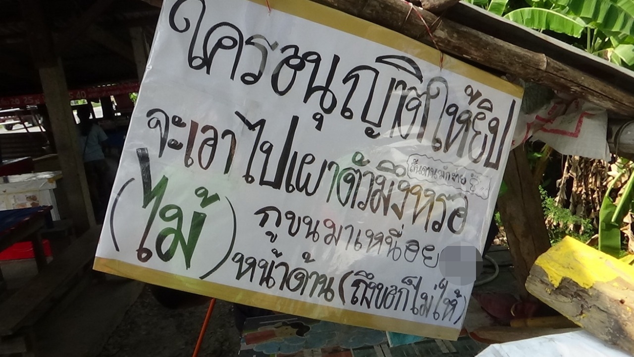 “ใครอนุญาตให้หยิบ จะเอาไปเผาตัวเมิงเหรอ สันดานมักง่าย ไม้กรูขนมาเหนื่อย.... หน้าด้าน (ถึงขอก็ไม่ให้)” โดยมีลูกค้า และประชาชนที่ผ่านไปผ่านมา ที่พบเห็นต่างสงสัยกันไปตามๆ กันว่าขนาดฟืนที่ใช้ในการทำอาหารทำมาหากินยังถูกมือดีขโมยไปจากร้านอาหารที่ปลูกเป็นเพิงเล็กๆ จนเจ้าของร้านต้องขึ้นป้ายเขียนประชด