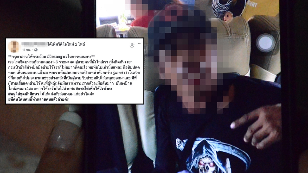จากกรณีที่ผู้ใช้เฟซบุ๊กรายหนึ่ง โพสต์วิดีโอ พร้อมข้อความระบุว่า "กรุณาอ่านให้ครบถ้วน มีวิจารณญาณในการชมนะคะ เจอโรคจิตบนรถตู้สายคลอง1-6 ราชมงคล ผู้ชายคนนี้นั่งใกล้เรา (นั่งติดกัน) เอากระเป๋าผ้าสีม่วงปิดมือซ้ายไว้ เราก็ไม่อยากคิดอะไร พอหันไปเท่านั้นแหละ คือซิปปลดหมด เห็นหมดแบบแข็งอะ พอเราเห็นมันบอกจอดป้ายหน้าด้วยครับ รู้เลยจ้าว่าโรคจิต นี่ก็เลยหันไปมองหาคนช่วยข้างหลังที่เป็นผู้ชาย รีบถ่ายคลิปไว้ละลุกออกมาเลย มีพี่ผู้ชายเสื้อแดงช่วยไว้ ละพี่ผู้หญิงจับมือเราเพราะเรากลัวละมือสั่นมาก มันลงป้ายโลตัสคลอง 4 ค่ะ อยากให้ระวังกันไว้ด้วยค่ะ #แชร์ได้เพื่อให้วังตัวค่ะ #หนูใส่ชุดนักศึกษา ไม่ได้แต่งตัวล่อแหลมแต่อย่าใดค่ะ #มีคนโดนคนนี้ทำหลายคนแล้วด้วยค่ะ"