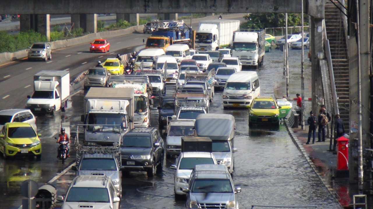 นอกจากนี้ บริเวณทางลงจากสะพานต่างระดับหน้าตลาดสี่มุมเมือง มีน้ำท่วมขังประมาณ 15 ซม. ทำให้รถยนต์ที่สัญจรมาจากเส้นทางสะพานใหม่-อนุสรณ์สถาน ต้องประสบปัญหารถติด และต้องขับรถลุยน้ำท่วมขังบริเวณไหล่ทาง ส่งผลให้รถติดต่อเนื่อง เป็นระยะทางยาาว