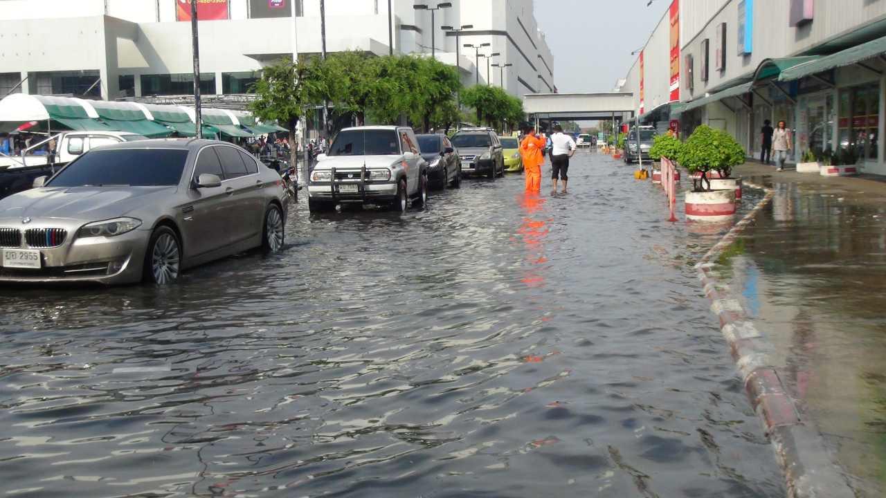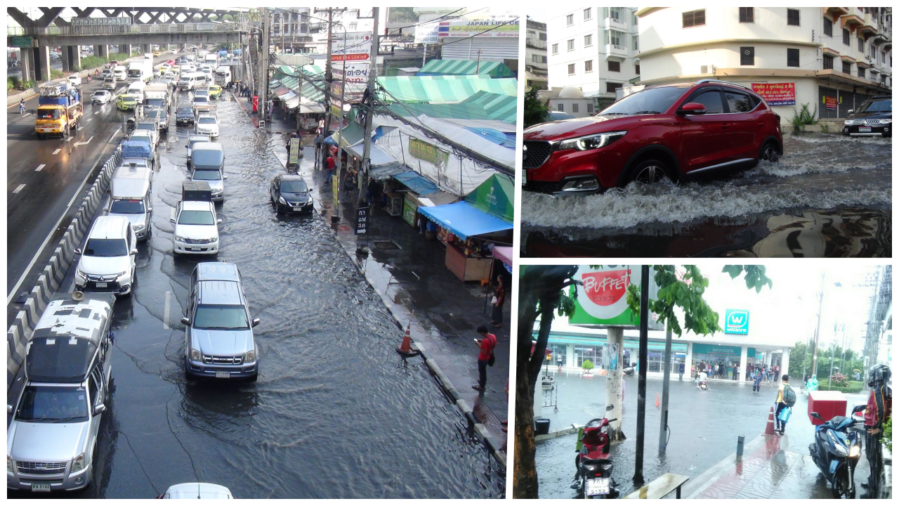 ฝนตกหนัก ท่วมถนนพหลโยธินหน้าห้างเซียร์ รังสิต การจราจรเป็นอัมพาต รถติดยาว ไหล่บ่าเข้าในห้างโบ๊เบ๊ พ่อค้าแม่ค้าต้องขนของหนีกันจ้าละหวั่น