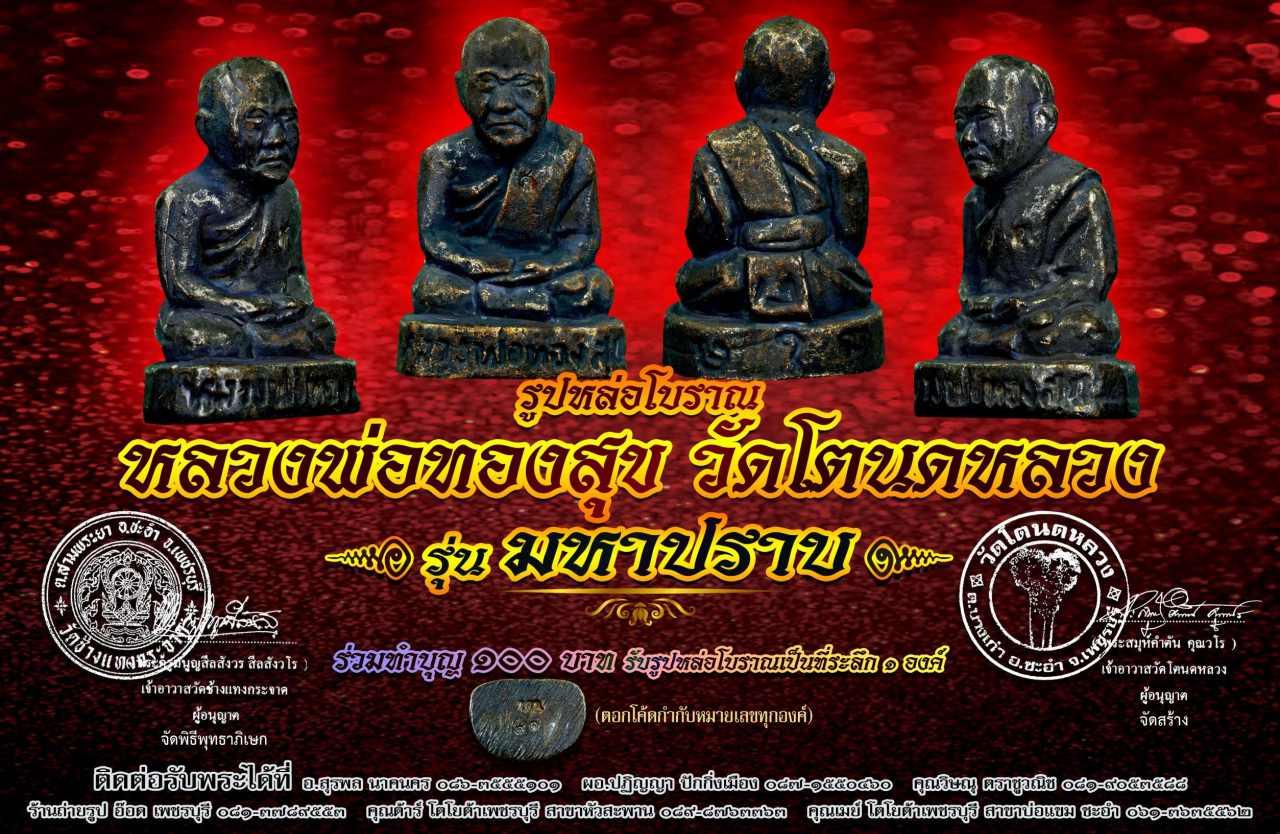 "ผู้มีจิตเป็นกุศลสนใจจะร่วมทำบุญสนับสนุนกิจกรรมสาธารณะประโยชน์จำนวน 100 บาท รับรูปหล่อโบราณหลวงพ่อทองสุข วัดโตนดหลวง รุ่นมหาปราบ เนื้อทองผสมรมดำ 1 องค์ ติดต่อติดต่อสอบถามได้ที่ นายสุรพล นาคนคร กรรมการและที่ปรึกษาสมาคมสื่อมวลชนเพชรบุรี โทรศัพท์ 086-3555101 นายปฏิฏญา ปักกิ่งเมือง 087-1550460 นายวิษณุ ตราชูวณิช 081-9053588 ร้านถ่ายรูปอ๊อด เพชรบุรี 081-3789553 นายรัตนะ พุ่มพวง โตโยต้าเพชรบุรี สาขาหัวสะพาน 089-8763363 เมย์ โตโยต้าเพชรบุรี สาขาบ่อแขม ชะอำ 089-8763363 และนายเดโช ทรัพย์เกิด 087-9322995"
