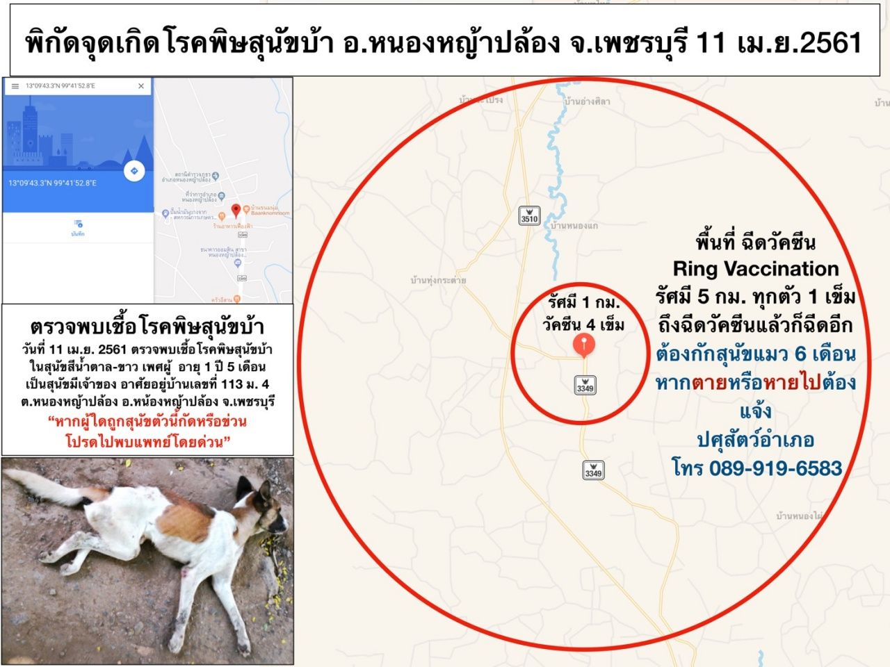 สำหรับรายละเอียดของประกาศฉบับนี้ สืบเนื่องมาจากเมื่อวันที่ 11 เม.ย. 2561 ตรวจพบเชื้อโรคพิษสุนัขบ้า ในสุนัขสีน้ำตาล-ขาว เพศผู้ อายุ 1 ปี 5 เดือน อาศัยอยู่บ้านเลขที่ 113 ม.4 ต.หนองหญ้าปล้อง อ.หน้องหญ้าปล้อง จ.เพชรบุรี ดังนั้น “หากผู้ใดถูกสุนัขตัวนี้กัดหรือข่วน โปรดไปพบแพทย์โดยด่วน” ทั้งนี้ นับเป็นอำเภอที่ 3 แล้วใน จ.เพชรบุรี ที่พบการติดเชื้อพิษสุนัขบ้า.