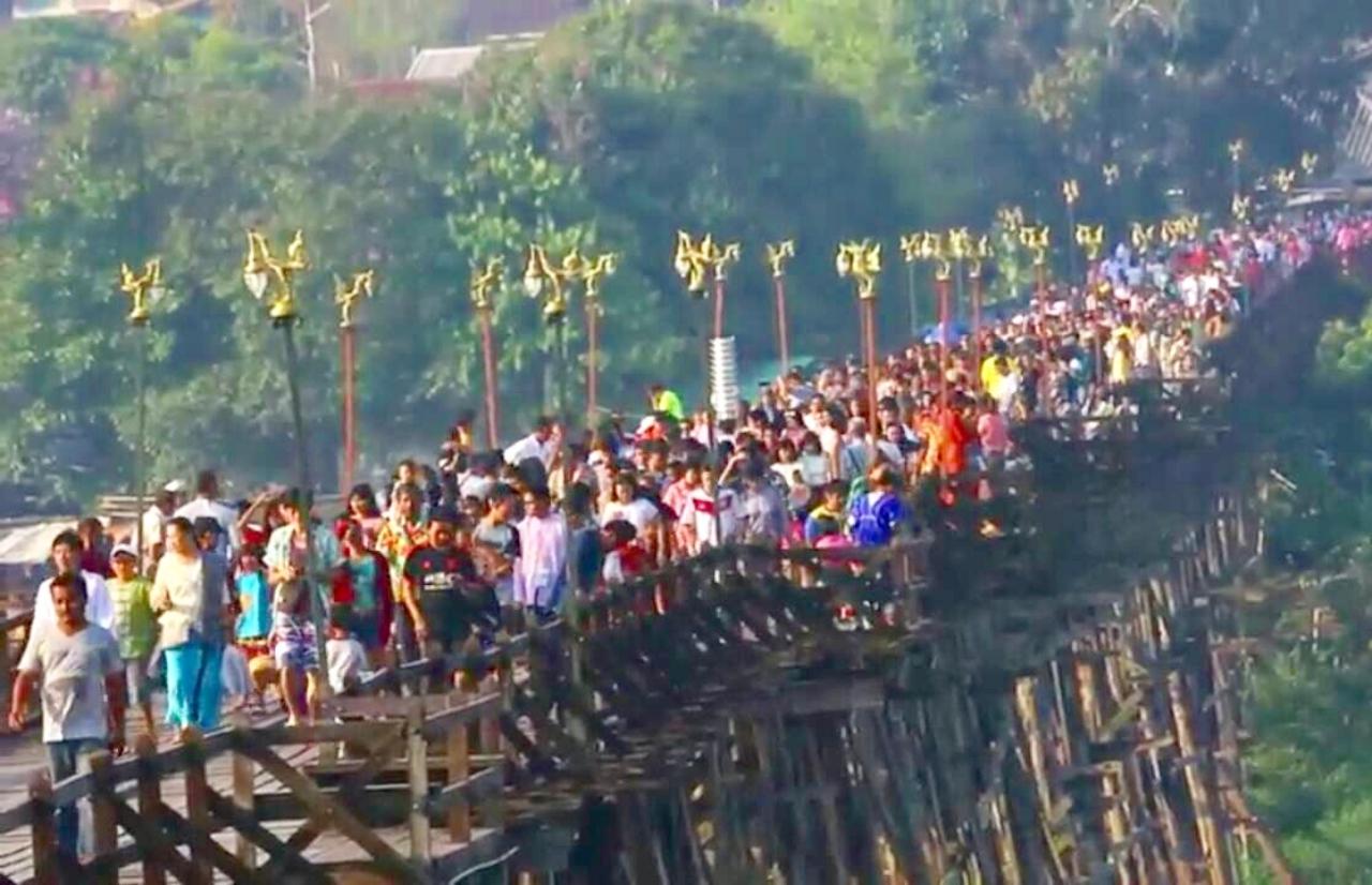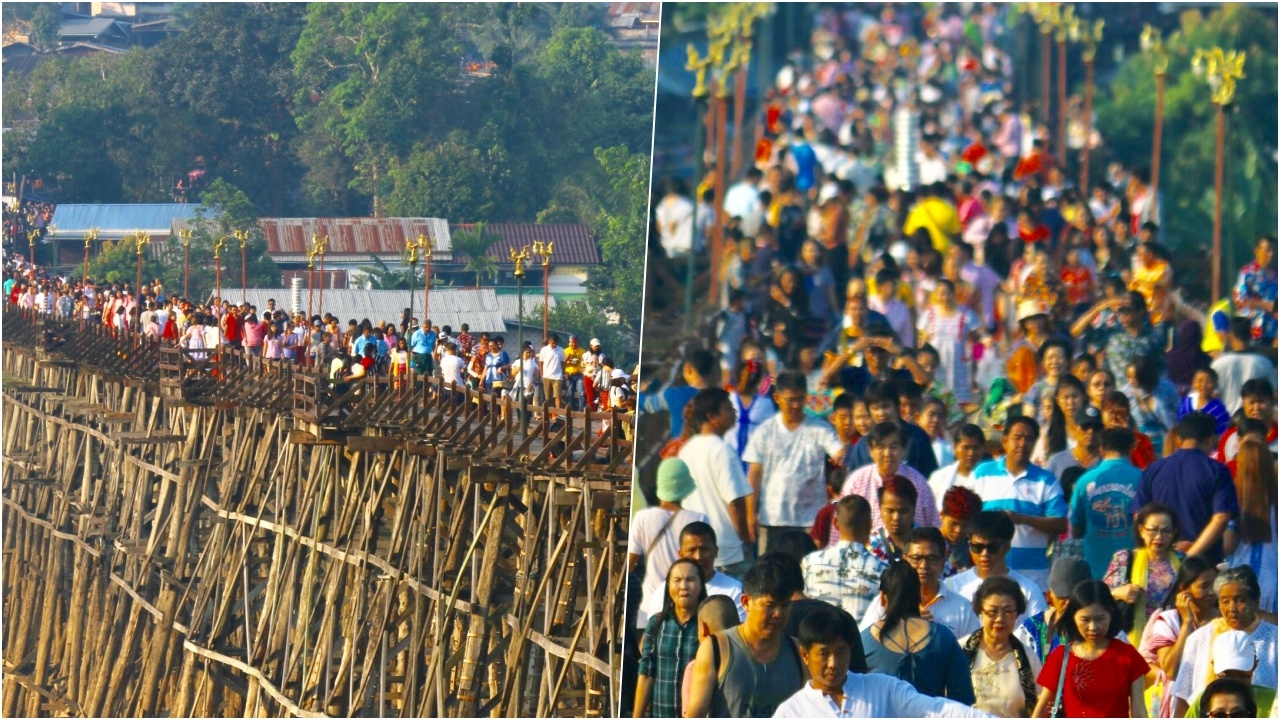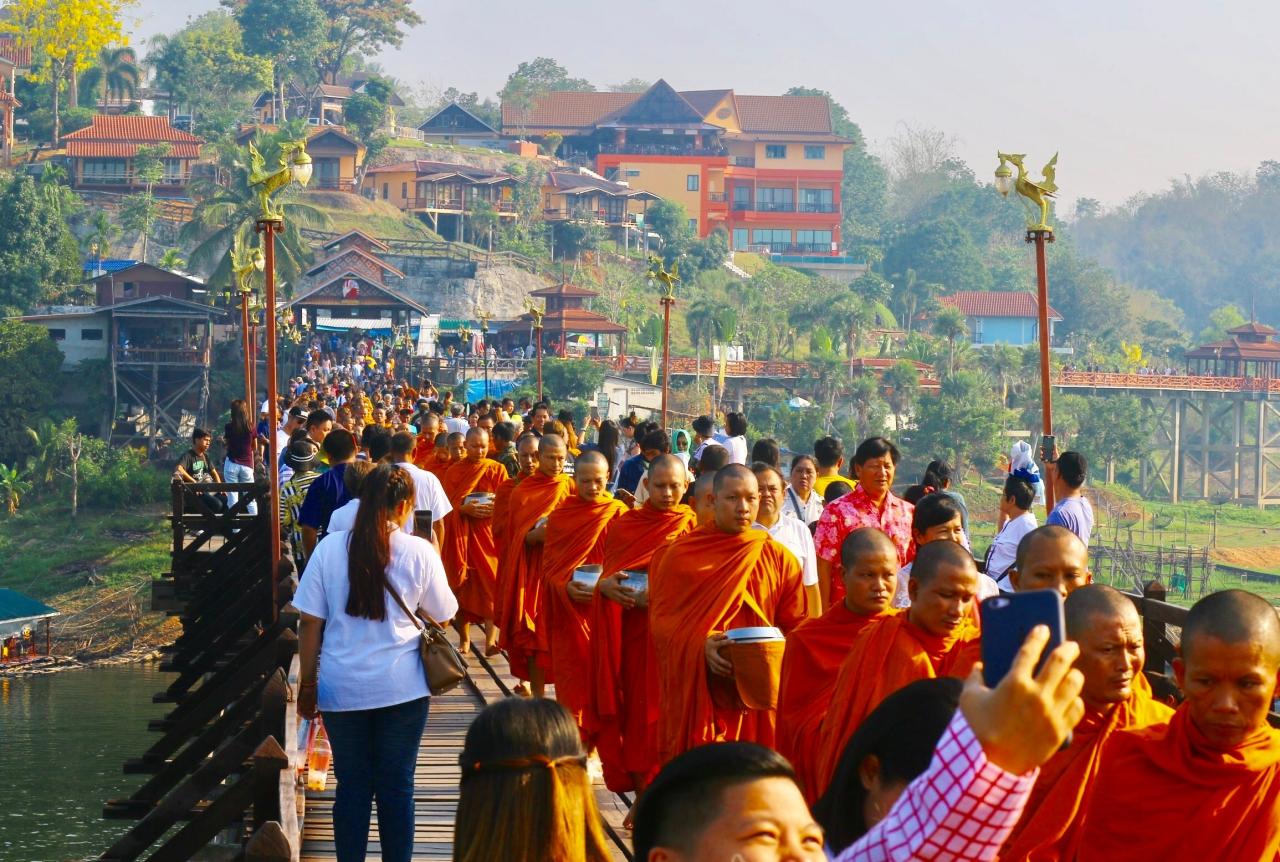 นักท่องเที่ยวทั้งไทยและต่างชาติ แห่เที่ยวงานสงกรานต์ ที่สังขละบุรี ร่วมตักบาตรบนสะพานไม้หลวงพ่ออุตตมะกันคึกคัก ขณะที่ไฮไลต์ของประเพณีสงกรานต์มอญ เป็นพิธีสรงน้ำพระผ่านรางในวันที่ 17 เม.ย.