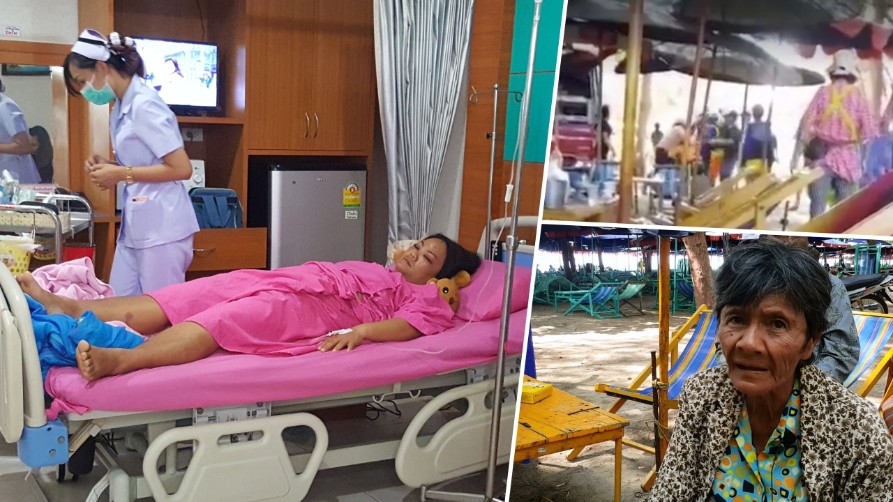 และหลังจากนั้นก็มียายอายุ 78 ปี มาห้ามก็โดนทำร้ายด้วย เหี้... มาก มีชายใส่แว่นหยิบเหล็กแหลมที่ยึดเสาเต็นท์มาฟาดและจะแทงอีก ผมไม่รู้ว่าจิตใจพวกมึงทำด้วยอะไร ทำร้ายรุมกันขนาดนี้ แถมอาวุธครบมือ แถมตะโกนบอกอีกจะตีให้ตาย แล้วมันก็ชี้ไปที่แขนมันบอกแขนมันเป็นรอย(แผลมึงถ้าไม่ซูมคงไม่เห็น) คนอื่นที่มาเที่ยวก็เยอะมาก แม่งไม่สนใจไม่กลัวเกรงกฎหมายเลย # ตอนเห็นที่มันต่อยตัวๆ นึกว่าต่อยกับผู้ชาย แม่เจ้าสึดเป็นป้าผู้หญิง พอต่อยตัวๆ ท่าทางสู้ป้าไม่ไหว แม่งหมาหมู่ทันทีพร้อมอาวุธ #ผมถ่ายคลิปได้ตอนช่วงกลางๆ ครับ เพราะก็ตกใจมีลูกสาวกับภรรยามาด้วย พอตั้งสติได้เลยถ่ายคลิปเพราะเห็นมีคนเข้าไปช่วยห้าม หลังจากนั้นผมก็เลยโทรแจ้ง 191 และรถพยาบาลมารับผู้บาดเจ็บ"