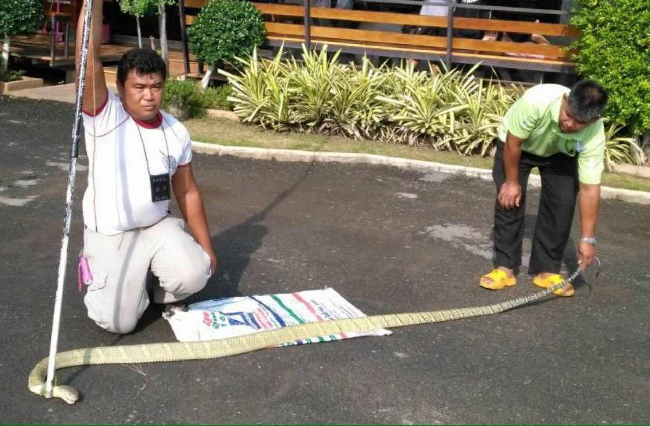 ขณะนั้นเอง งูจงอางตัวดังกล่าวได้ค่อยๆ เลื้อยไต่ลงมา เมื่อถึงครึ่งทาง พบคนเยอะ มุงดูและส่งเสียงดัง ทำให้งูตกใจเลื้อยขึ้นยอดไม้ไปอีกครั้ง เจ้าหน้าที่จึงต้องใช้อุปกรณ์คล้องคองู แล้วนำลงมาด้านล่างได้อย่างปลอดภัย เบื้องต้นงูที่พบเป็นงูจงอางเผือกขนาดใหญ่ วัดขนาดความยาวของลำตัวได้ถึง 4.7 เมตร เจ้าหน้าที่จึงนำงูจงอางเผือกตัวนี้ ปล่อยคืนสู่ธรรมชาติต่อไป