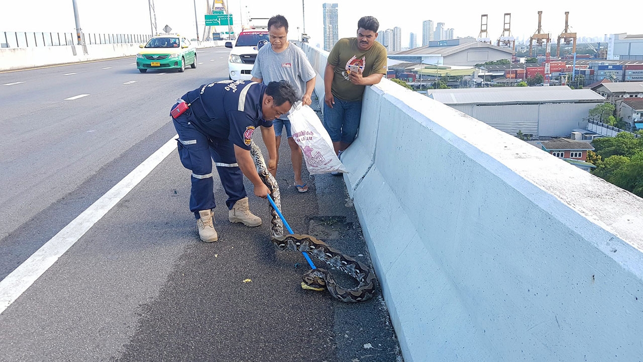 เจ้าหน้าที่อาสาสมัคร มูลนิธิป่อเต็กตึ๊ง ช่วยกันจับงูเหลือมขนาดลำตัวยาวประมาณ 4-5 เมตร น้ำหนักร่วม 30 กก. หลังชาวบ้านผู้ใช้ถนนพบเลื้อยอย่างน่าหวาดกลัวบนสะพานภูมิพล 2 ท้องที่ ต.บางหญ้าแพรก อ.พระประแดง จ.สมุทรปราการ กว่าจะจับได้ทำเอาแทบหืด ขึ้นคอ เพราะงูตัวใหญ่แถม ดุร้ายพุ่งจะฉกหลายครั้ง.