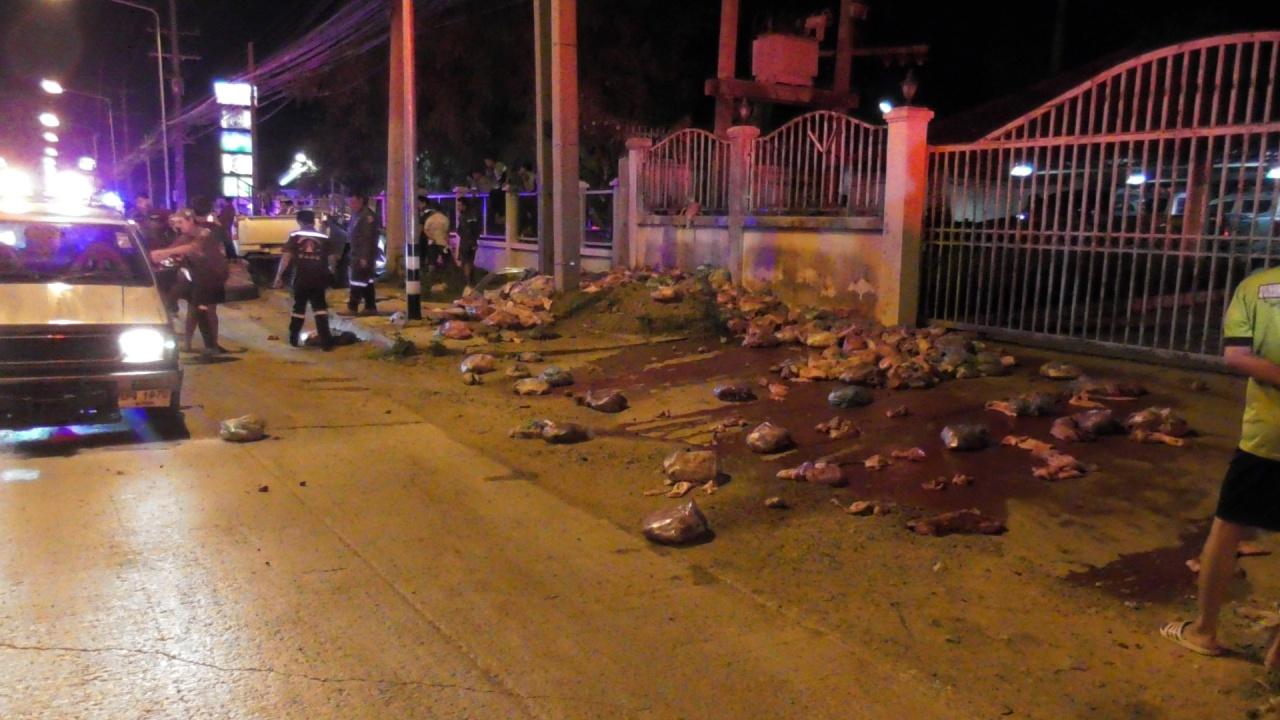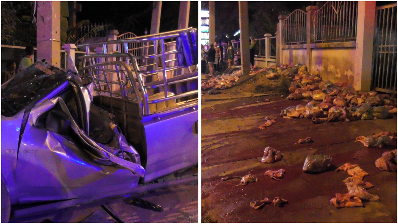 รถกระบะ บรรทุกหมูสดที่ อ.นครชัยศรี จ.นครปฐม ซิ่งชนเสาไฟฟ้า มีผู้บาดเจ็บเป็นคนขับหนุ่มวัย 29 ปี รถติดในรถ หมูกระจายเกลื่อนถนน