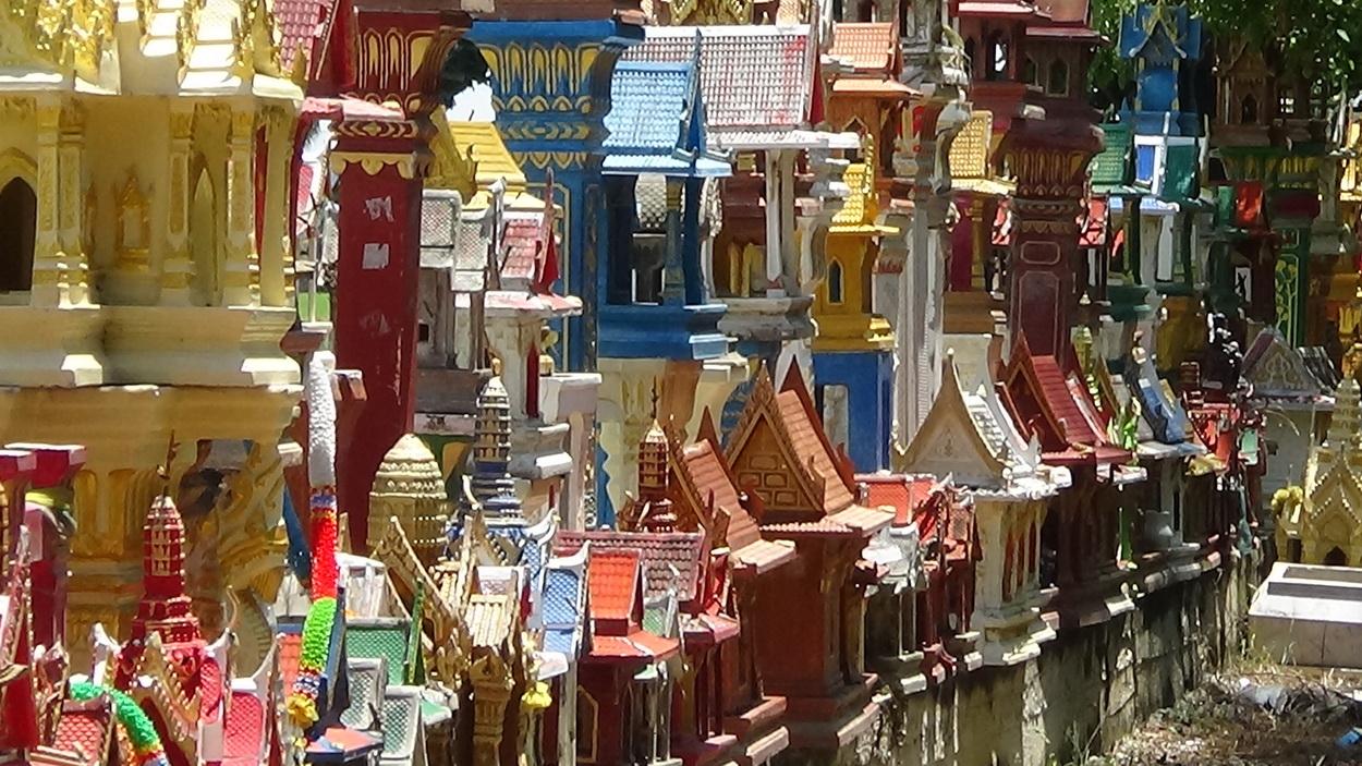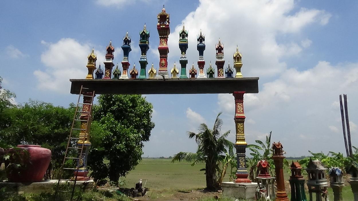 ด้าน พระอธิการสำอางค์ กล่าวว่า ทางวัดขอรับบริจาคศาลพระภูมิเจ้าที่จากชาวบ้านที่เปลี่ยนศาลพระภูมิใหม่ รื้อทิ้งของเก่าแล้วเอาไปทิ้งตามข้างทาง เป็นการสร้างความหลอนต่อผู้พบเห็น ทำให้ต้องมีการเก็บไปทิ้งตามบ่อขยะ หรือบางแห่งก็ฝังดิน ซึ่งทางวัดต้องการศาลพระภูมิเจ้าที่ที่มีสภาพดีหน่อย หรือไม่ผุพังมากจนเกินไป นำมาส่งมอบให้ทางวัด เพื่อนำมาทำซุ้มประตูวัดพร้อมกำแพงวัด และทำการประดับตกแต่งโดยรอบบริเวณวัดอีกด้วย นอกจากจะสร้างความสวยงามแปลกตาแล้ว ยังเป็นการประหยัดค่าใช้จ่ายอีกด้วย