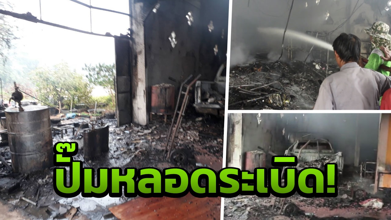ปั๊มน้ำมันหลอดกลางหมู่บ้าน บึมสนั่นไฟลุกท่วม ไหม้บ้านที่เป็นร้านค้าวอดพร้อมรถกระบะ 1 คัน คาดแม่บ้านเปิดแก๊สทำอาหารเช้า สะเก็ดไฟกระเด็นไปโดนน้ำมันเบนซินที่ใส่ขวดไว้เตรียมขาย