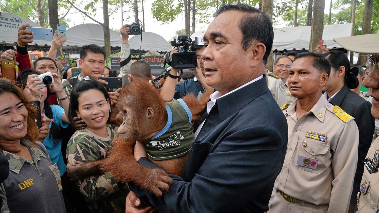 พล.อ.ประยุทธ์ จันทร์โอชา นายกฯ อุ้ม “ชิซูกะ” ลูกลิงอุรังอุตังขึ้นมาหยอกล้ออย่างอารมณ์ดี ระหว่างลงพื้นที่เปิดโครงการประชารัฐร่วมใจ ปลูกต้นไม้ให้แผ่นดิน ที่ ต.เขาชะงุ้ม อ.โพธาราม จ.ราชบุรี.