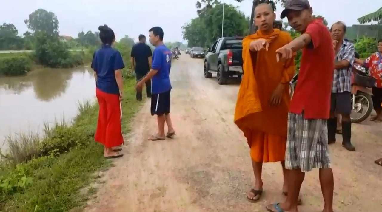 ที่ริมคลองชลประทานพบคนกำลังมุงดู สอบถามชายสูงวัย ชื่อลุงถนอม บอกว่า ช่วงเช้าตนกำลังจะออกมาใส่บาตร ก็ได้ยินเสียงคนร้องขอความช่วยเหลือ ว่ามีพระตกน้ำ และมีรถลูกศิษย์จมน้ำด้วย ตนจึงรีบออกมาดูพร้อมถอดเสื้อเพื่อให้ความช่วยเหลือ แต่ไม่ทัน ลูกศิษย์วัดจมน้ำหายไป