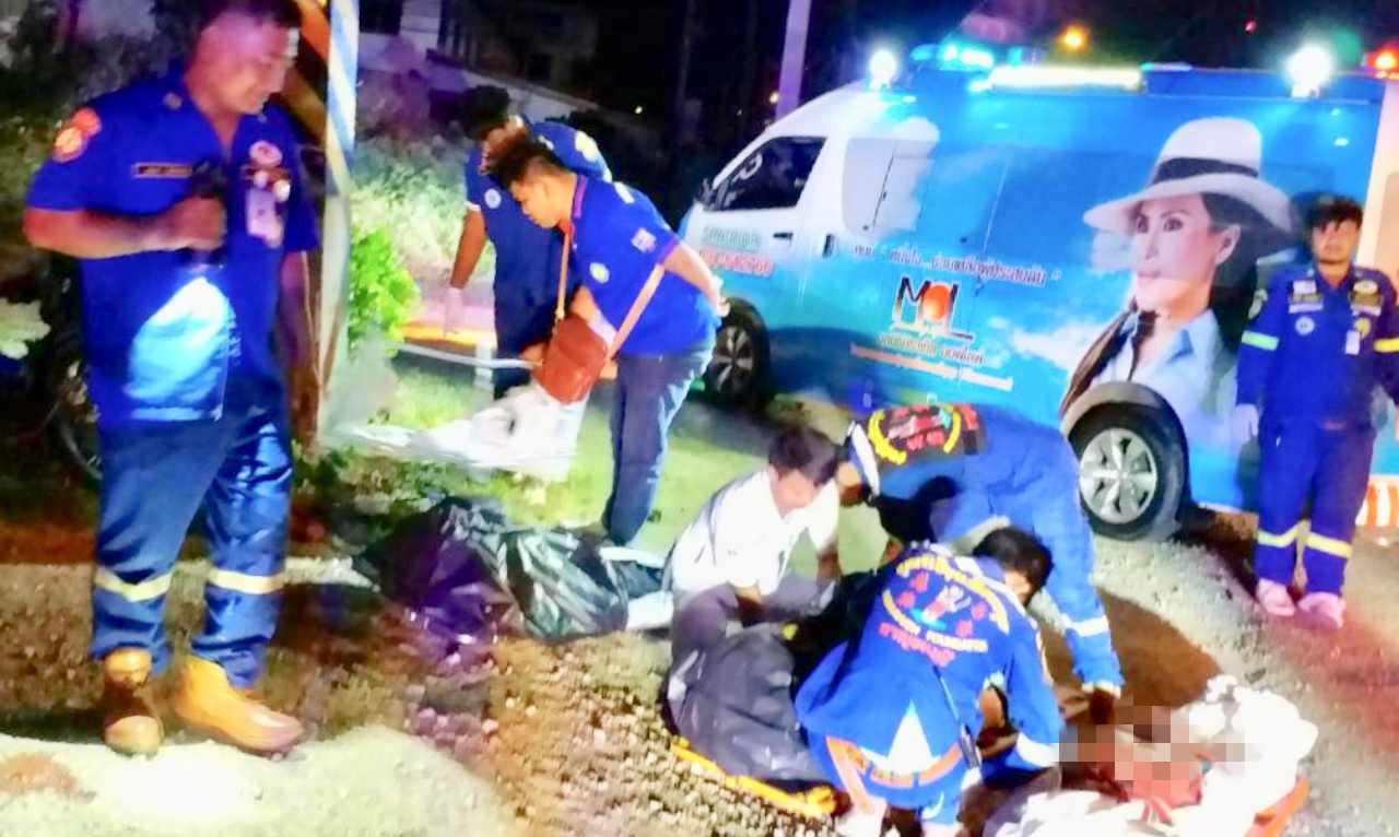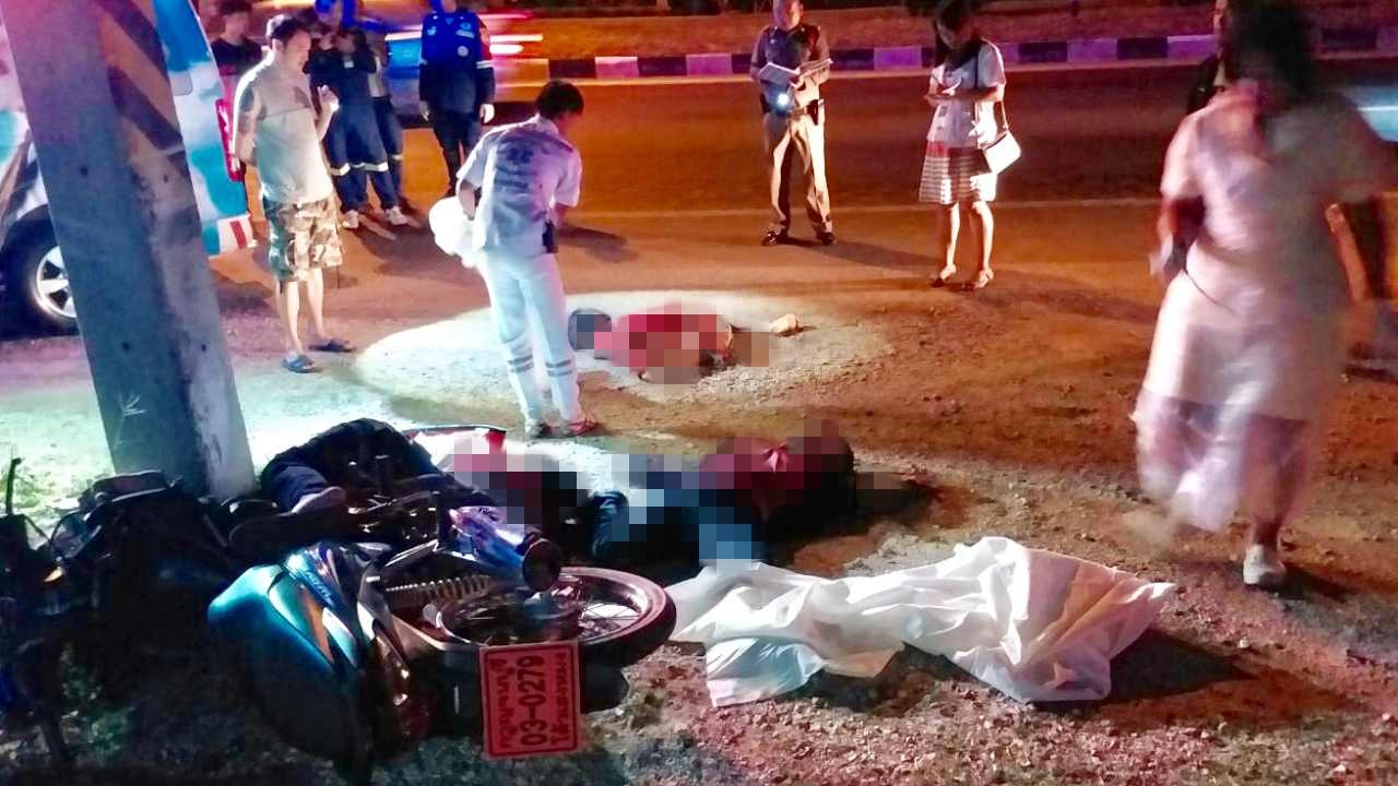 เกิดอุบัติเหตุช่วงกลางดึก บนถนนแสงชูโต อ.ท่าม่วง จ.กาญจนบุรี หนุ่มวัยรุ่นนั่ง จยย.ซ้อน3 รถไม่เข้าโค้ง พุ่งชนเสาไฟฟ้าริมถนนอย่างจัง คนกระเด็นตก แขนขาหักอยู่บนถนน มาด้วยกัน 3 คน ตายหมดทั้ง 3