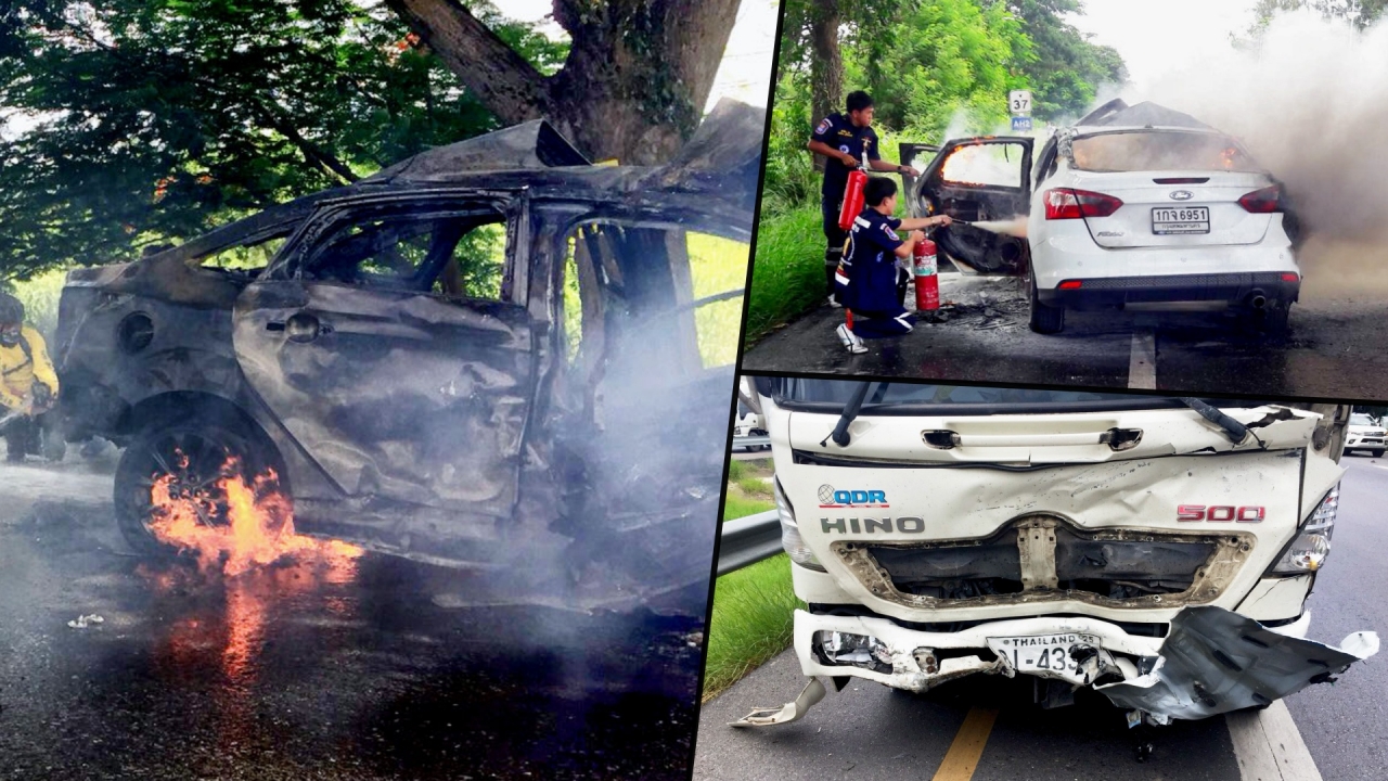 รถสิบล้อพุ่งชนรถเก๋งเตรียมไปเที่ยวตลาดน้ำหัวหินสามพันนาม คนในรถ 8 ชีวิตรีบหนีเอาชีวิตรอด ก่อนไฟลุกไม้ท่วมคันเหลือแต่ซาก...