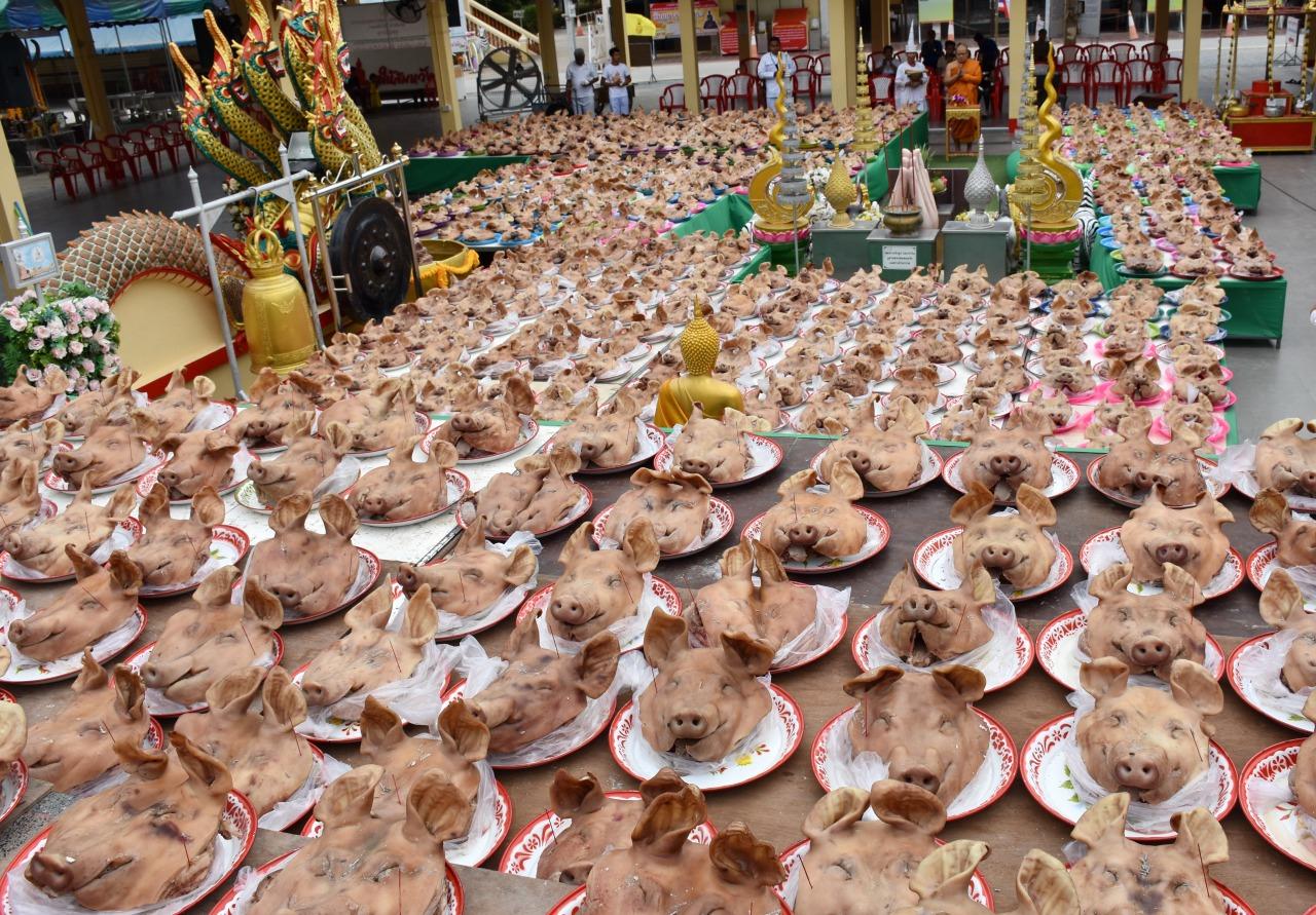 ด้านพระครูศรีสุตากร เจ้าอาวาส หลังเสร็จสิ้นพิธี น.ส.ธีรนันท์ เจ้าของถวายหัวหมู ไม่ขอนำหัวหมูกลับโดยแจ้งความประสงค์หลังเสร็จสิ้นพิธีแล้วให้ทางวัดแจกจ่ายให้กับชาวบ้านที่อยู่ในตำบลบางพระ ให้ได้ทานกัน โดยพระครูศรีสุตากร ได้ประกาศเสียงตามสายให้ชาวบ้านที่อยู่ในตำบลบางพระ ให้มารับหัวหมูได้ทุกบ้าน โดยจัดให้บ้านละ 1 หัว ตามความประสงค์ของเจ้าภาพที่บนไว้ มีประชาชนในพื้นที่และสาธุชนที่มากราบไหว้ต่างเข้าแถวรับยาวนับกิโลฯ.