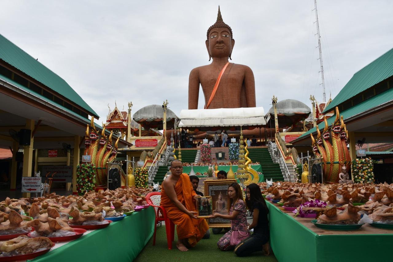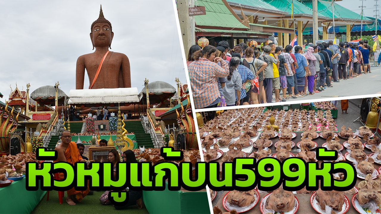 เมื่อวันที่ 2 ส.ค.61 ที่วัดกลางบางพระ ต.บางพระ อ.นครชัยศรี จ.นครปฐม น.ส.ธีรนันท์ วัฒนชัยสิทธิ์ อายุ 39 ปี พนักงานโรงงานซันแพคเกจจิ้ง นครปฐม อยู่บ้านเลขที่ 99 ถนนเทศบาล ต.พระปฐมเจดีย์ อ.เมืองนครปฐม พร้อมครอบครัว นำหัวหมูต้มสุก 599 หัว นำมาแก้บนหลวงพ่อสมหวัง พระพุทธรูปศักดิ์สิทธิ์ สูง 30 เมตร วัดกลางบางพระ เจ้าหน้าที่วัดต้องนำใส่ถาดเรียงรายตั้งแต่ลานด้านหน้าจนแน่นยังไม่พอล้นไปที่บันไดทางขึ้น สร้างความฮือฮาให้กับผู้ที่เดินทางมากราบไหว้หลวงพ่อสมหวัง