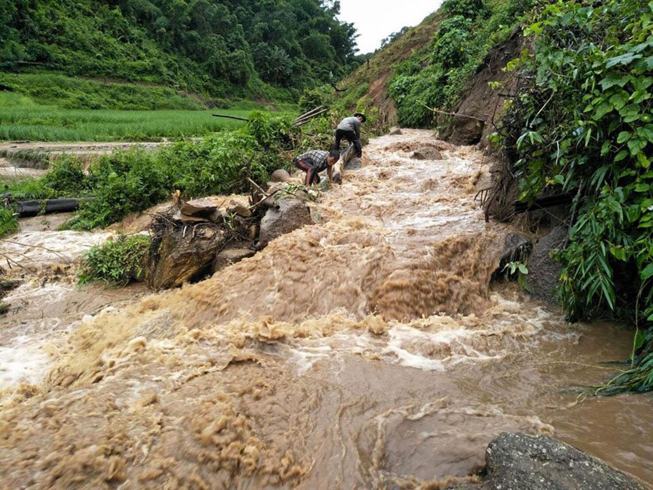 จ.แม่ฮ่องสอน น้ำป่าไหลเข้าท่วมพื้นที่บ้านแม่ปุ๋น ต.ป่าแป๋ อ.แม่สะเรียง เสียหายเป็นบริเวณกว้าง และยังเกิดเหตุดินภูเขาสไลด์ลงมาปิดทับเส้นทางสายบ้านไก่ดำ-บ้านห้วยเดื่อเหนือ ต.ป่าแป๋ รถไม่สามารถสัญจรไปมาได้ น้ำจากแม่น้ำสะมาดเอ่อท่วมไร่นาราษฎรบ้านผาบ่อง หมู่ 1 ต.ผาบ่อง อ.เมืองแม่ฮ่องสอน เสียหายบริเวณกว้าง โรงเรียนสอนศาสนาคริสต์บ้านแม่สะกึ๊ด ต.ผาบ่อง ถูกน้ำท่วมเสียหายหลายหลัง วัวชาวบ้านถูกน้ำพัดหายไป 50 ตัว เส้นทางไปยังแหล่งท่องเที่ยวหมู่บ้านกะเหรี่ยงคอยาวห้วยปูแกงและหมู่บ้านชายแดนน้ำเพียงดิน มีดินสไลด์ปิดทับเส้นทาง ไม่สามารถเข้าออกหมู่บ้านได้เช่นกัน