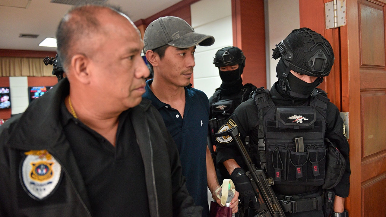 ตำรวจ กก.1.บก.ปส. และชุดสยบไพรี คุมตัวนายเดชอุดม หรือเดช แสงสายทับทิม (สวมหมวก) น้องชายของกานต์-วิภากร ศุขพิมาย อดีตภรรยา “เสก โลโซ” ร็อกเกอร์ ดัง มาดำเนินคดีฐานค้าไอซ์.