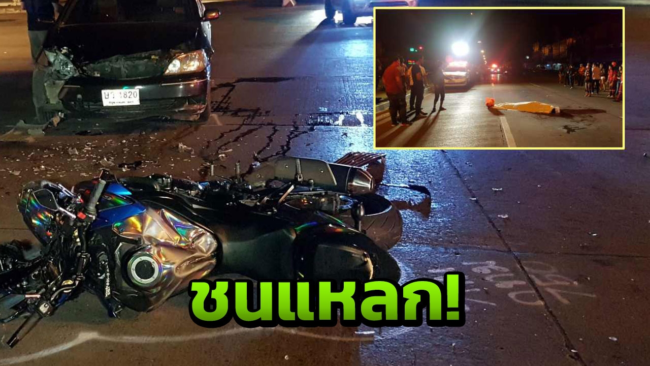 สองหนุ่มชาวกรุงเทพฯ ขี่บิ๊กไบค์ 750 ซีซี ถึง อ.อุทัย กรุงเก่า พุ่งชนรถเก๋งที่ขับออกจากร้านก๋วยเตี๋ยว ร่างลอยกระเด็นตกฟาดพื้นถนน ตายคาที่ 1 บาดเจ็บสาหัส 1