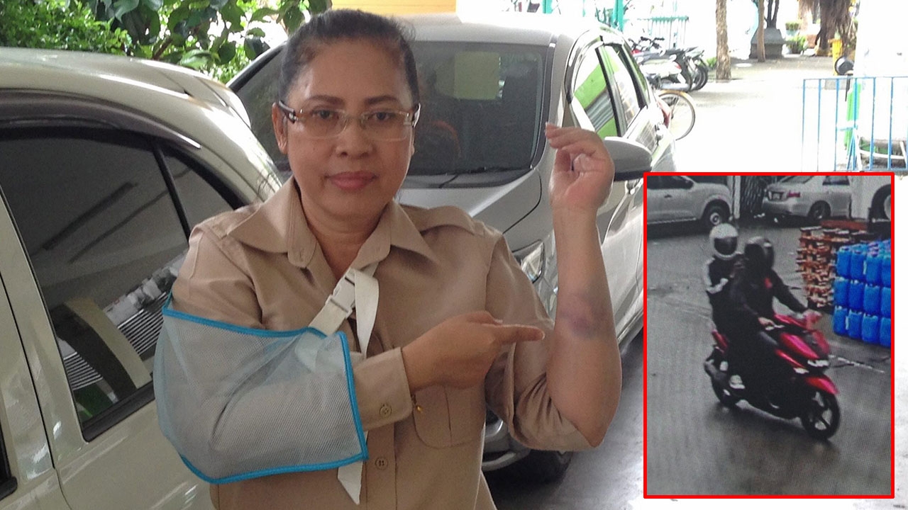 นางวราภรณ์ ทองมา รอง ผอ.รักษาการ ผอ.ร.ร.นครนนท์วิทยา 5 อ.เมืองนนทบุรี ชี้รอยเขียวช้ำที่แขน หลังคนร้ายขี่รถ จยย. (รูปเล็ก) สะกดรอยตามรถเก๋งผู้เสียหายมาจอดที่โรงเรียน เมื่อสบโอกาสคนซ้อนท้ายใช้ไม้กระหน่ำตีครู ต้องร้องขอความช่วยเหลือ ตำรวจตั้งปมความขัดแย้ง ไว้ 3 ประเด็น.