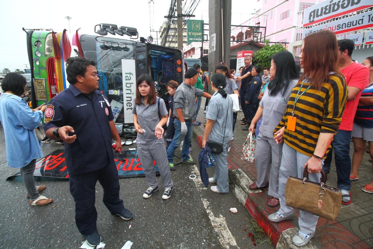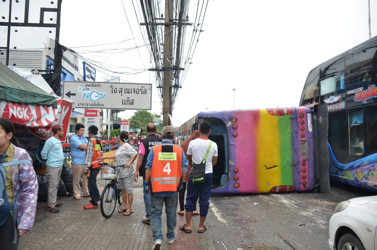 ที่เกิดเหตุ เจ้าหน้าที่พบรถบัส ยี่ห้อนิสันยูดี หมายเลขทะเบียน 30-1516 ปทุมธานี ของบริษัทปิยสุวรรณ 29 ซึ่งเป็นรถบัสรับ-ส่งพนักงาน บริษัท ฟาบริเนท จํากัด พลิกตะแคงซ้ายอยู่กลางถนน จากการตรวจสอบในเบื้องต้นพบว่ามีพนักงานทั้งชายและหญิงได้รับบาดเจ็บจำนวนมาก เจ้าหน้าที่กู้ภัยจึงได้รีบช่วยกันพาผู้ได้รับบาดเจ็บออกมาจากรถและปฐมพยาบาลเบื้องต้น ก่อนที่จะรีบลำเลียงผู้ได้รับบาดเจ็บส่งโรงพยาบาลใกล้เคียง ทั้งหมด 31 ราย