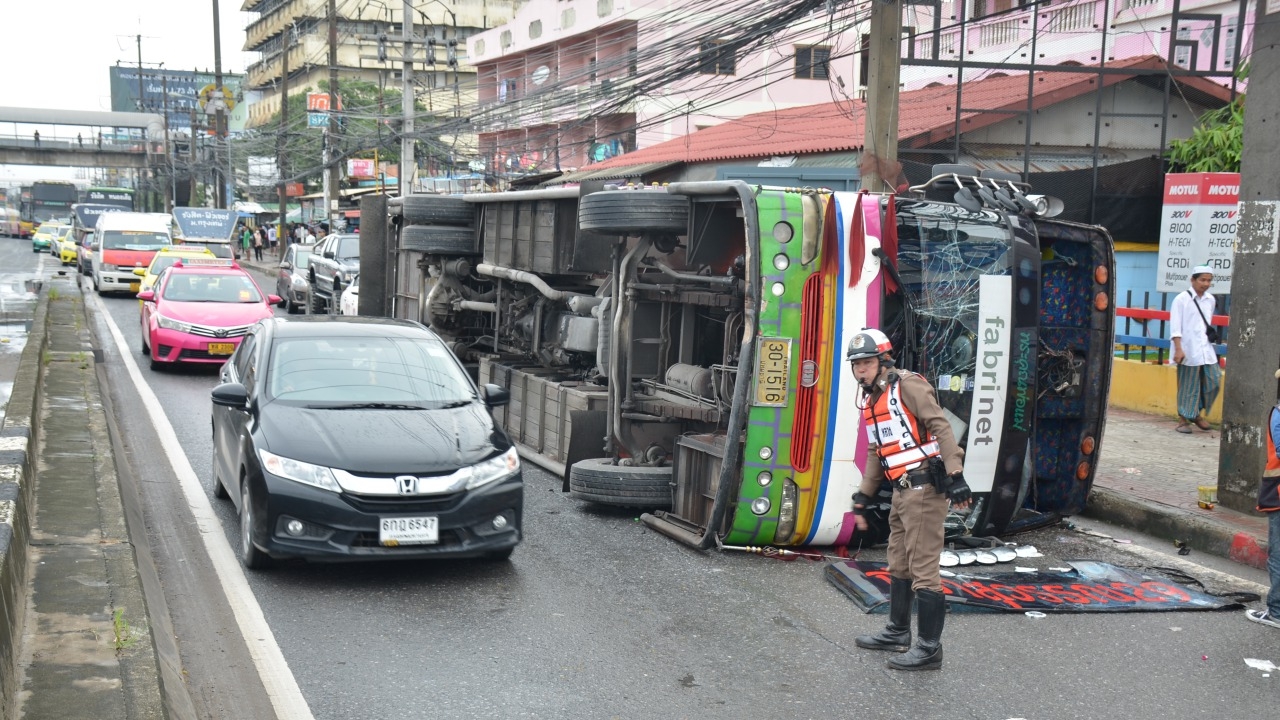 รถบัสรับส่งพนักงานโรงงานพลิกคว่ำบนถนนพหลโยธินขาเข้า พื้นที่ อ.คลองหลวง เบื้องต้นพบผู้บาดเจ็บกว่า 30 ราย ด้าน ตำรวจคุมตัวคนขับอยู่ในสภาพมึนเมา...
