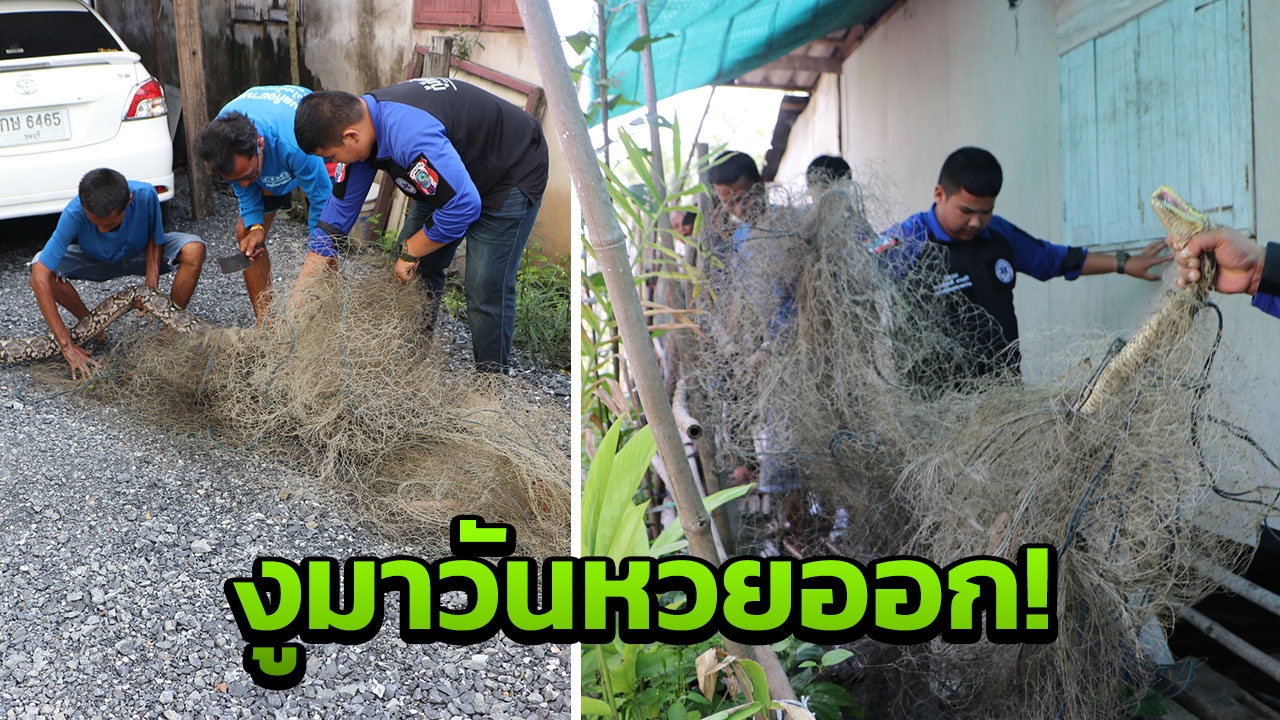 เหตุเกิดหลังบ้านเลขที่ 33! กู้ภัยเร่งช่วย 'งูเหลือม' ยาว 4.50 เมตร แอบเลื้อยไปกินปลา แต่เกิดติดตาข่ายอวน ทำให้รัดตัวไม่สามารถเลื้อยไปไหนได้ จนชาวบ้านมาพบพร้อมแจ้งให้คนช่วยเหลือ...