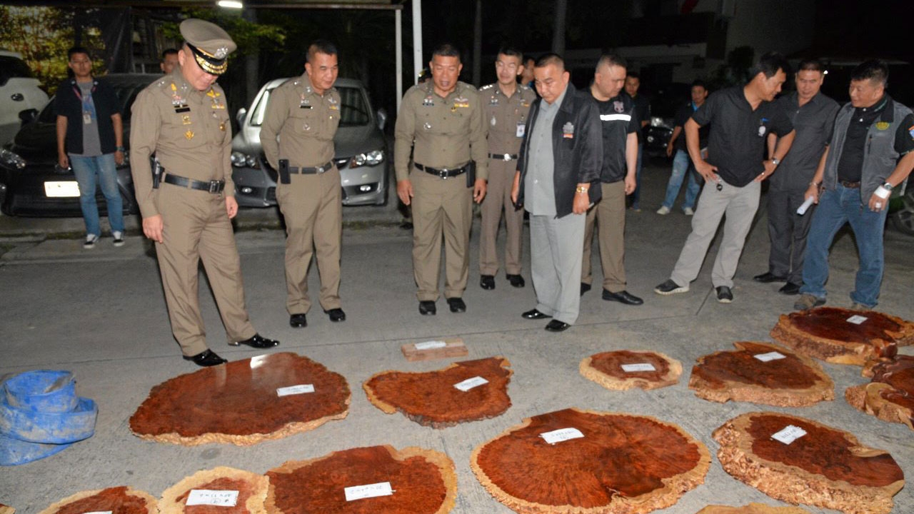 พล.ต.อ.ศรีวราห์ รังสิพราหมณกุล รอง ผบ.ตร. ตรวจดูไม้กระยาเลยแปรรูป 19 แผ่น ของ น.ส.สุนี วงศ์สิโรจน์กุล เจ้าของบริษัทไทยโยธา 37 ที่ให้ลูกน้องขนขึ้นรถกระบะขับออกจากบ้านใน อ.ปากเกร็ด จ.นนทบุรี ถูกตำรวจไล่ตามจับได้ ส่วนภายในบ้านยังพบไม้เถื่อนอีกจำนวนมาก.