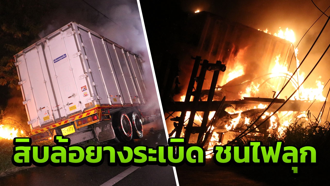 อุบัติเหตุสุดระทึก!! สิบล้อบรรทุกสินค้ามาเต็มคัน จู่ๆยางหน้าฝั่งซ้ายเกิดระเบิด ทำรถเสียหลักพุ่งชนเสาไฟฟ้าแรงสูง ไฟลุกท่วม คนขับถูกไฟคลอก อาการสาหัส แข็งใจปีนออกจากรถ วิ่งหนีตาย