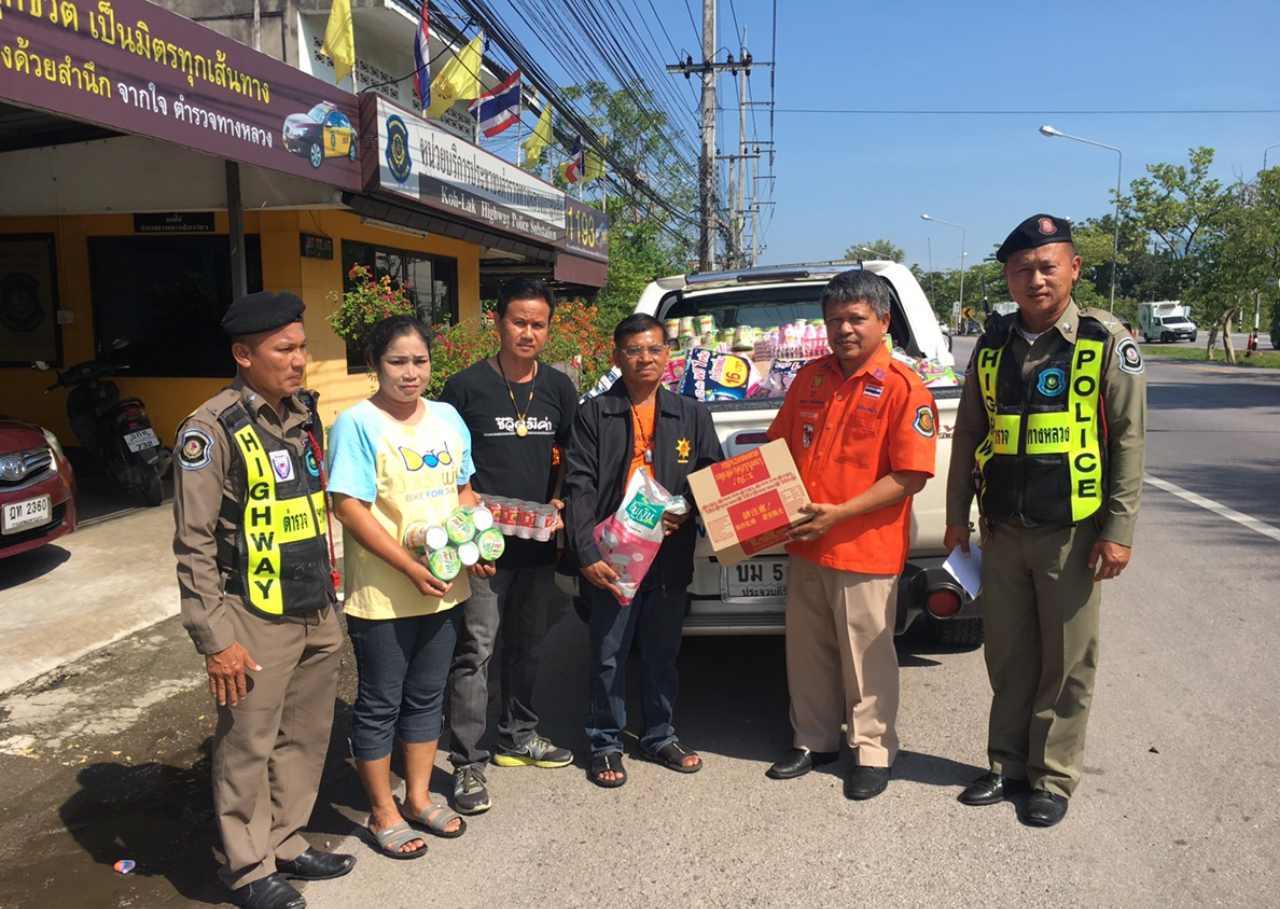 ขณะเดียวกัน ด.ต.วังทอง ศรัณวิริยะพงศ์ หัวหน้าหน่วยบริการประชาชนตำรวจทางหลวงเกาะหลัก จ.ประจวบคีรีขันธ์ ด.ต.ธำมรงค์ กำไลทอง นายสมควร สายโพธิ์ทอง หัวหน้าอาสากู้ภัยตำรวจทางหลวงอำเภอเมืองประจวบคีรีขันธ์ รับมอบสิ่งของช่วยเหลือจากผู้ประสบภัย โดยมีตัวแทนของ นายณภัทร ชุ่มจิตตรี หรือ คิง ก่อนบ่าย นักแสดงตลกชื่อดังซึ่งเป็นชาวอำเภอเมืองประจวบคีรีขันธ์ นำเงินสนับสนุนซื้อของใช้จำเป็นสำหรับช่วยเหลือผู้ประสบภัยน้ำท่วมที่ อ.บางสะพาน ประกอบด้วย ข้าวสาร น้ำดื่ม ปลากระป๋อง บะหมี่กึ่งสำเร็จรูป โจ๊กสำเร็จรูป ผ้าอนามัย แปรงสีฟัน ยาสีฟัน แป้ง สบู่ ผงซักฟอก กระดาษชำระ ซึ่งเจ้าหน้าที่นำบรรจุใส่ถุงเป็นชุดๆ