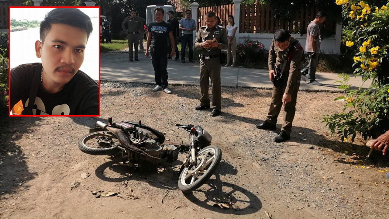 ตำรวจตรวจที่เกิดเหตุคนร้ายยิงนายชานนท์ ประเสริฐศรี (รูปเล็ก) ลูกชายนายอำนาจ ประเสริฐศรี ผู้ใหญ่บ้าน หมู่ 5 ต.คำหยาด อ.โพธิ์ทอง จ.อ่างทอง ขณะจอดรถ จยย.เล่นโทรศัพท์มือถือหน้าบ้าน และไปเสียชีวิตที่ รพ. คาดปมจากเรื่องชู้สาวหรือหักหลังธุรกิจมืด.