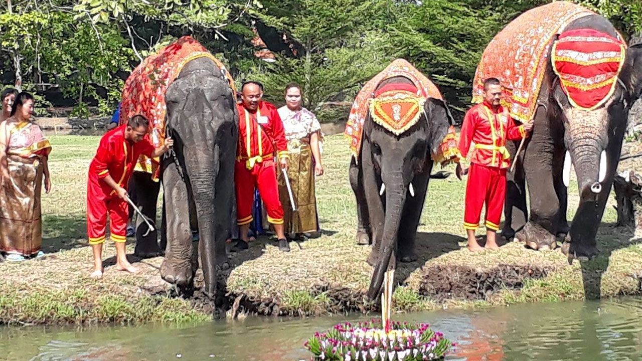 ควาญนำขบวนช้างแห่ ร่ายรำร้องเพลงจากวังช้าง แลเพนียดจ.พระนครศรีอยุธยา ไปลอยกระทงในสระน้ำใกล้คุ้มขุนแผน บริเวณอุทยานประวัติศาสตร์ พร้อมเชิญชวน นักท่องเที่ยวให้มาเที่ยวงานวันลอยกระทงที่เมืองกรุงเก่า.