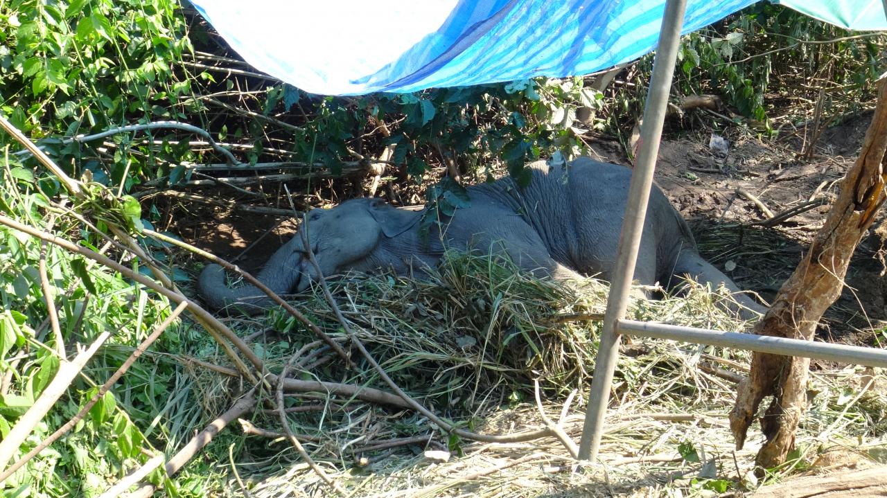 ส่วนบริเวณที่ลูกช้างป่านอนเจ็บอยู่นั้น ได้ให้เจ้าหน้าที่พิทักษ์ป่า ทำหลังคาเพื่อกันแดด และคอยราดน้ำที่ตัวลูกช้าง เพื่อลดความร้อนจากสภาพอากาศที่ร้อนจัด และพยายามจะหักยอดอ่อนของหน่อสับปะรดไปวางไว้ใกล้เพื่อให้ลูกช้างใช้งวงจับเข้าปากกินเป็นอาหารและคอยหยอดน้ำใส่ปากและงวง เพราะลูกช้างอดอาหารเข้าวันที่ 2 เกรงจะไม่มีแรงและอ่อนเพลียมากขึ้นได้ ซึ่งจากการสังเกตอาการล่าสุดพบว่า วันนี้ลูกช้างขาหลังด้านขวาเหมือนจะมีแรงมากขึ้น ยังคงตะเกียดตะกายเพื่อพยายามจะลุกขึ้นยืนตลอดเวลา แม้ว่าจะยังคงมีอาการบวมอยู่ หลักจากที่เมื่อวานนี้ได้รับการรักษาเบื้องต้นจากสัตวแพทย์หญิงกชพร พิมพ์สิน นายสัตวแพทย์ประจำสถานีเพาะเลี้ยงสัตว์ป่าห้วยทรายอันเนื่องมาจากพระราชดำริ ที่ฉีดยาลดปวดและยาปฏิชีวนะเพื่อแก้อาการอักเสบที่ขาหลังด้านขวาให้กับลูกช้าง