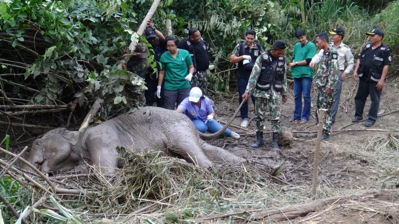 นายทัศเนศวร์ เพชรคง หัวหน้าอุทยานแห่งชาติกุยบุรี พร้อมด้วยสัตวแพทย์หญิงกชพร พิมพ์สิน นายสัตวแพทย์ประจำสถานีเพาะเลี้ยงสัตว์ป่าห้วยทรายอันเนื่องมาจากพระราชดำริ จ.เพชรบุรี และทีมสัตว์แพทย์เข้าตรวจอาการลูกช้างป่า พบว่าขาหลังขวาเริ่มบวมอักเสบจนไม่มีแรงพยุงตัว จึงได้ทำการฉีดยาแก้ปวดและยาปฏิชีวนะจำนวน 2 เข็ม เพื่อเป็นการบรรเทาอาการบาดเจ็บในเบื้องต้นที่สามารถทำได้สาเหตุจากเจ้าหน้าที่ทั้งหมดต้องออกจากจุดเกิดเหตุมายังพื้นที่ปลอดภัย เป็นการชั่วคราว เนื่องจากสภาพอากาศเข้าสู่ช่วงกลางคืน และมีโขลงช้างป่าขนาดใหญ่อีก 17ตัว ออกหากินในละแวกดังกล่าว และเดินตรงมายังจุดที่ลูกช้างนอนอยู่ อาจเกิดอันตรายแก่เจ้าหน้าที่หากอยู่ในจุดเกิดเหตุ
