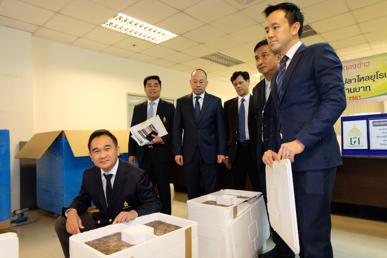 เมื่อเวลา 11.30 น. วันที่ 21 ธันวาคม 2561 ที่ฝ่ายสืบสวนและปราบปราม ส่วนควบคุมทางศุลกากร สำนักงานศุลกากรตรวจสินค้าท่าอากาศยานสุวรรณภูมิ ชั้น 3 ตึก BC เขตปลอดอากรท่าอากาศยานสุวรรณภูมิ อ.บางพลี จ.สมุทรปราการ นายกฤษฎา จีนะวิจารณะ อธิบดีกรมศุลกากร นายพันธ์ทอง ลอยกุลนันท์ ผอ.สํานักงานศุลกากรตรวจสินค้าท่าอากาศยานสุวรรณภูมิ นายธาดา ชุมไชโย ผอ.สํานักสืบสวนและปราบปราม นายกิตติพงศ์ กิตติขจร รอง ผอ.ท่าอากาศยานสุวรรณภูมิ (สายปฏิบัติการ 1) นายไกสฤษดิ์ พูนพาณิชย์ รรท.ผอ.กองควบคุมการนําเข้าส่งออกสัตว์นํ้าและปัจจัยการผลิต กรมประมง และ นายภูริธัช วัชรสินธุ์ หัวหน้าด่านตรวจสัตว์นํ้าทางอากาศยานสุวรรณภูมิ ร่วมกันแถลงผลการตรวจยึดปลาไหลยุโรปสายพันธุ์ Anguilla anguilla หรือ ปลาไหลแก้ว ซึ่งเป็นชนิดพันธุ์ที่อยู่ในบัญชีหมายเลข 2 ของอนุสัญญาว่าด้วยการค้าระหว่างประเทศซึ่งชนิดสัตว์ป่าและพืชป่าที่ใกล้สูญพันธุ์ (CITES) และชนิดสัตว์น้ำตามบัญชีแนบท้ายประกาศกระทรวงทรัพยากรธรรมชาติและสิ่งแวดล้อม เรื่อง กำหนดชนิดสัตว์ป่า ซากของสัตว์ป่าที่ห้ามนำเข้าหรือส่งออก น้ำหนักประมาณ 800 กิโลกรัม รวมมูลค่าประมาณ 40 ล้านบาท