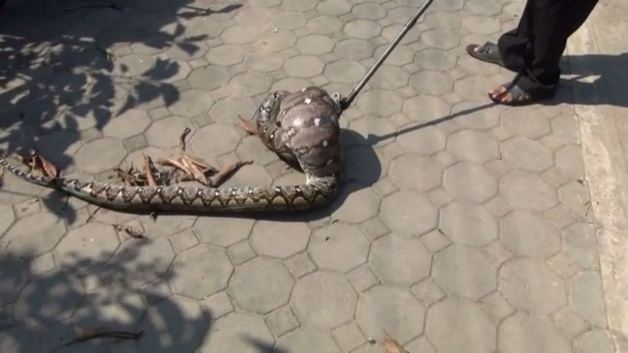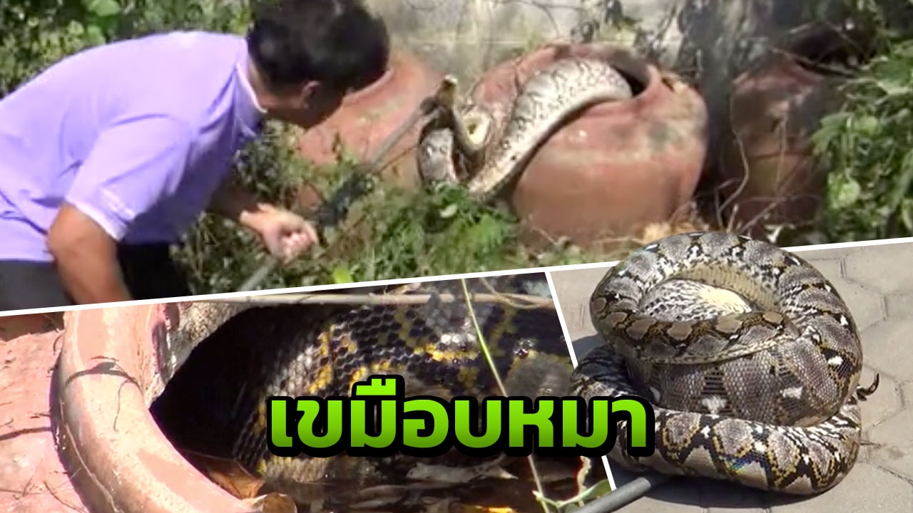 เจ้าของบ้านใน อ.เมืองชลบุรี แจ้งเจ้าหน้าที่กู้ภัยช่วยจับงูเหลือม หลังคนงานพบขณะตัดต้นไม้และถางหญ้าที่ขึ้นรกหลังบ้าน พบซุกในโอ่งน้ำ สภาพกลางลำตัวป่อง คาดเขมือบหมาจรจัด