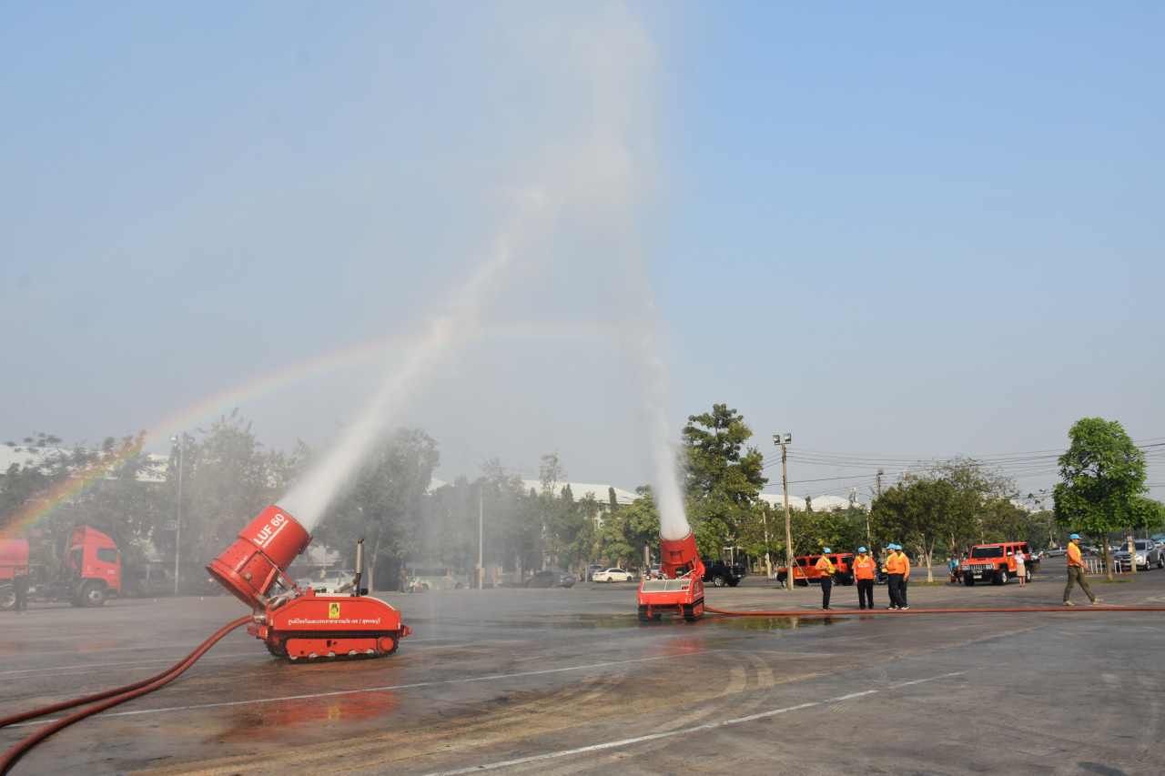 นายชาญนะ เอี่ยมแสง ผวจ.นครปฐม เผยว่า สำหรับชุดอุปกรณ์ดับเพลิงควบคุมระยะไกล หรือเครื่องพ่นน้ำฉีดกำจัดฝุ่นละอองนี้ได้รับการสนับสนุนมาจาก นายชาญชัย อตมศิริกุล ผู้อำนวยการศูนย์ป้องกันและบรรเทาสาธารณภัย เขต 2 สุพรรณบุรี ให้ยืมมาใช้ เพราะเห็นว่าเครื่องนี้สามารถช่วยบรรเทาได้ โดยเครื่องตัวนี้ฉีดเป็นละอองฝอยๆ ในระยะ 30 เมตร ใช้หลักการเดียวกันกับฝนเทียม เมื่อฉีดพ่นขึ้นไป ละอองฝุ่นจะก่อตัวตกลงมาบนพื้นดิน และทำความสะอาดอีกครั้ง
