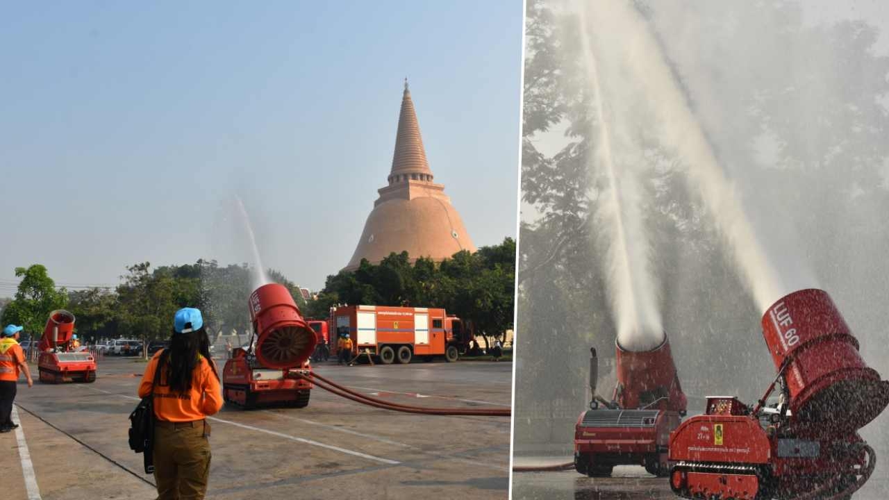 นครปฐม เมืองเจดีย์ใหญ่ ผจญฝุ่นละออง PM2.5 เกินค่ามาตรฐาน ผวจ.ต้องยืมเครื่องฉีดพ่นละอองน้ำ ศูนย์ ปภ. เขต 2 มาใช้กำจัดฝุ่น เผยส่วนใหญ่มาจากควันดำของรถเครื่องยนต์ดีเซลถึง 53%