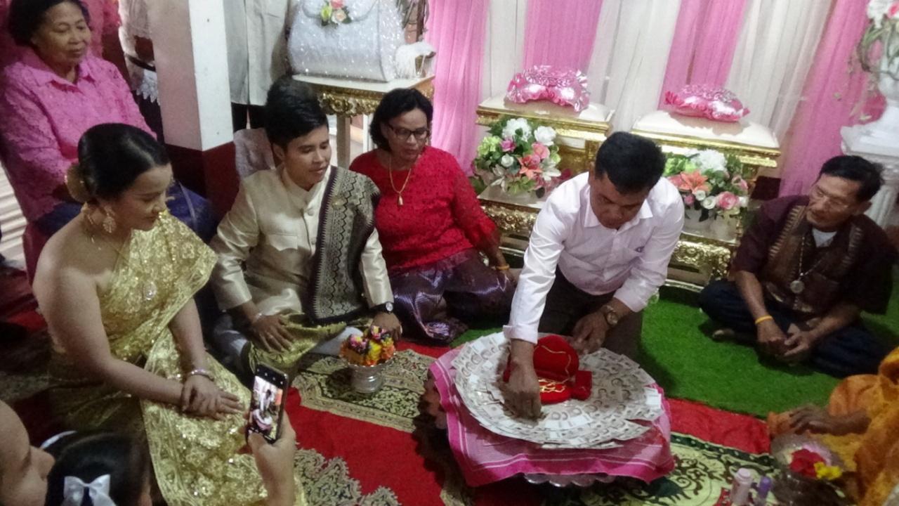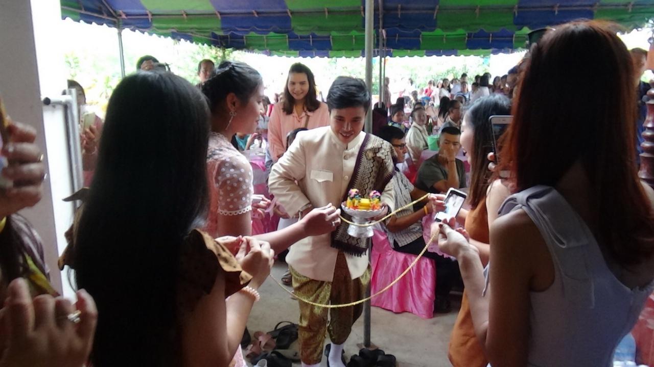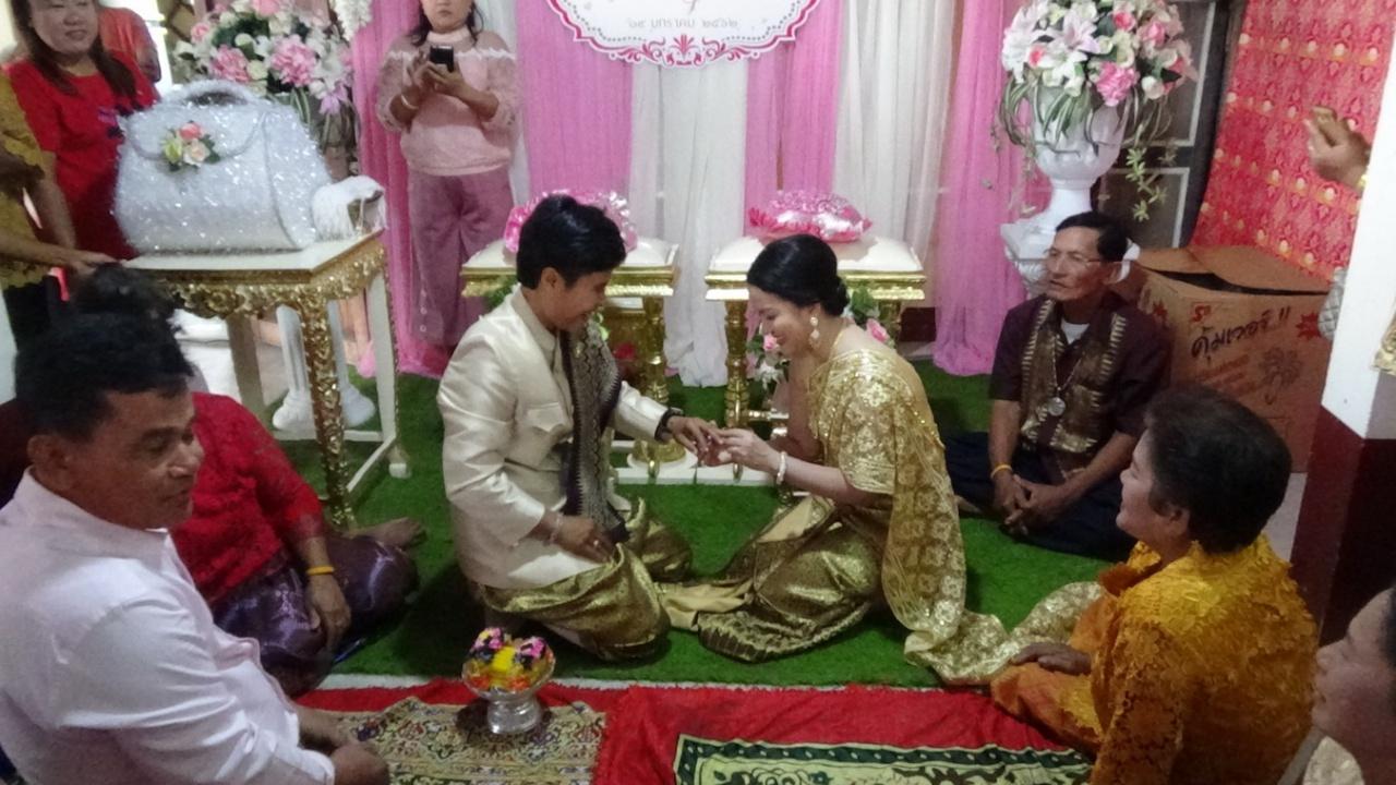 โดยเริ่มจากช่วงเช้าเวลา 09.09 น. มีพิธีแห่ขันหมาก เพื่อนฝูงต่างกั้นประตูเงินประตูทอง พร้อมให้ทางเจ้าบ่าวตะโกนบอกรักเจ้าสาว ท่ามกลางญาติผู้ใหญ่ที่มาร่วมงานเป็นสักขีพยานรักในครั้งนี้ ซึ่งเจ้าบ่าวตะโกนบอกรักเท่าฟ้า สัญญาว่าจะรักกันตลอดไป พร้อมพิธีผูกข้อไม้ข้อมือ รับไหว้ บ่าว-สาว ร่วมกันฉลองงานมงคลสมรส รับประทานอาหารโต๊ะจีน ท่ามกลางบรรยากาศ สนุกสนาน หวานสุดชื่นมื่น โดยมีเพื่อนฝูงและผู้มาร่วมงานต่างถ่ายภาพส่งขึ้นสังคมออนไลน์กันอย่างอย่างคึกคัก