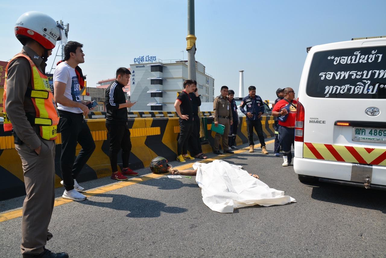 เมื่อเวลา 11.00 น. วันที่ 26 ม.ค.2562 ร.ต.อ.แซด สมพวง รอง สว.(สอบสวน) สภ.ปากเกร็ด จ.นนทบุรี รับแจ้งเหตุรถจยย.พลิกคว่ำมีผู้เสียชีวิตบนสะพานพระราม 4 บริเวณเหนือห้าแยกปากเกร็ด ถนนแจ้งวัฒนะ ฝั่งขาเข้า ต.ปากเกร็ด ไปสอบสวนพร้อมด้วย พ.ต.ท.ยศวิน เอี่ยมพุ่ม รอง ผกก.(สอบสวน) สภ.ปากเกร็ด แพทย์สถาบันนิติวิทยาศาสตร์และเจ้าหน้าที่กู้ภัยมูลนิธิป่อเต็กตึ๊ง