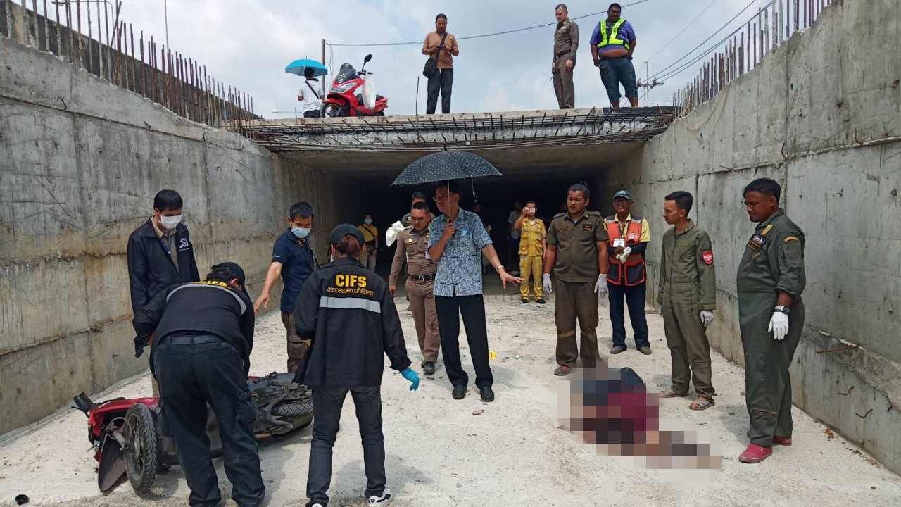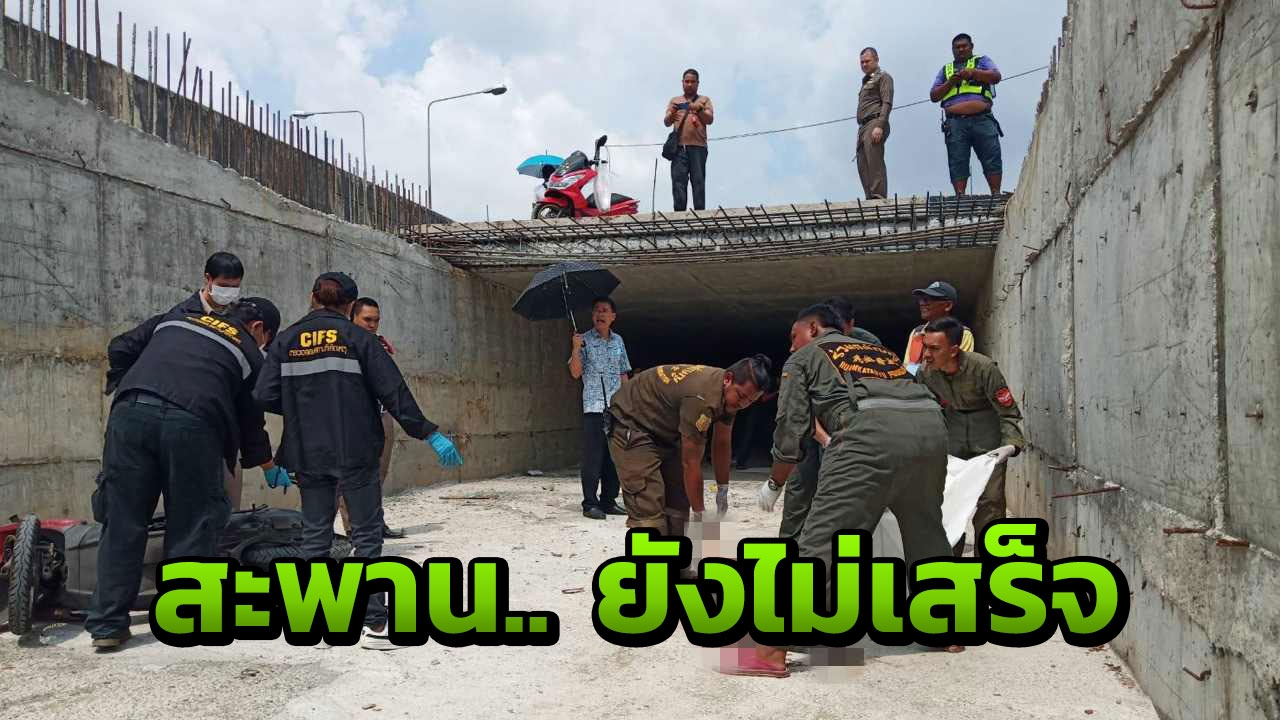สาววัยเบญจเพส นอนตายบนพื้นใต้บริเวณที่กำลังมีการก่อสร้างสะพานข้ามคลองบางบัวทอง ข้างศพมี จยย.ที่ตกลงมาพังยับ คาดไม่รู้ทาง หรือเข้าใจว่าสะพานสร้างเสร็จแล้ว รถข้ามได้