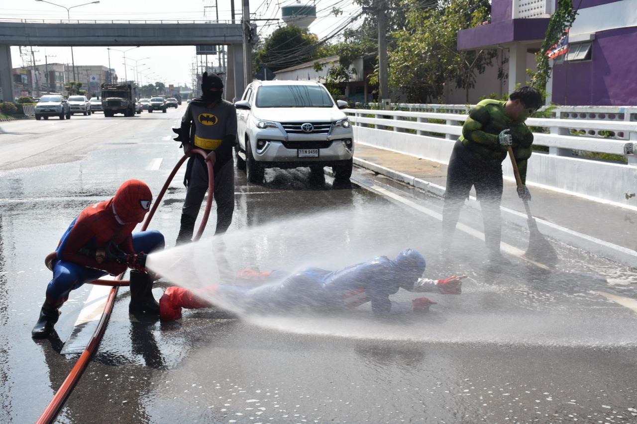 ชาวบ้านที่นครปฐม ฮือฮา 4 ซุปเปอร์ฮีโร่ปฏิบัติหน้าที่ในการฉีดน้ำล้างถนนลดฝุ่น 2.5PM เผย ทั้ง 4 เป็นพนักงานดับเพลิงตัวจริงที่ใส่ชุดเพื่อสร้างความเพลิดเพลินแก่คนที่ผ่านไปมา คลายเครียดรถติด...