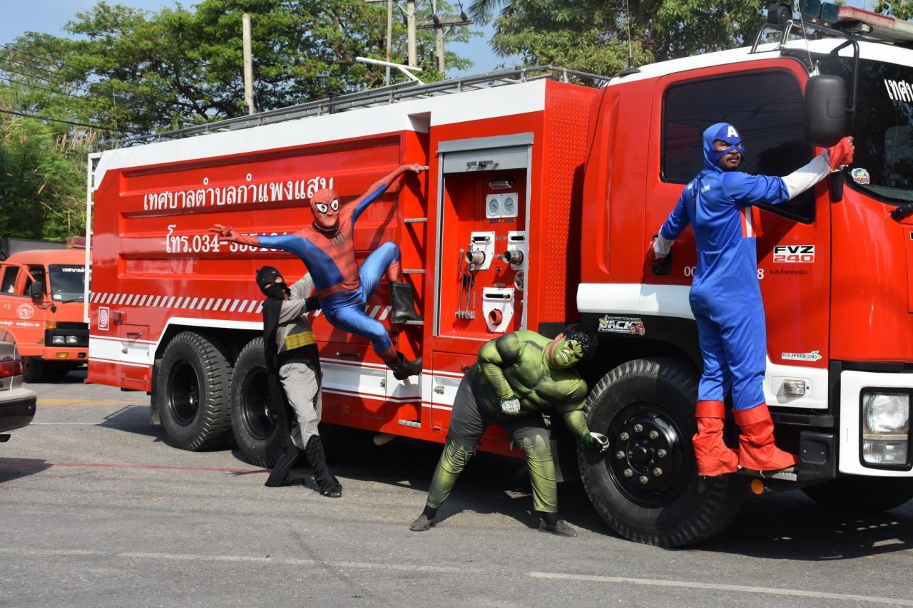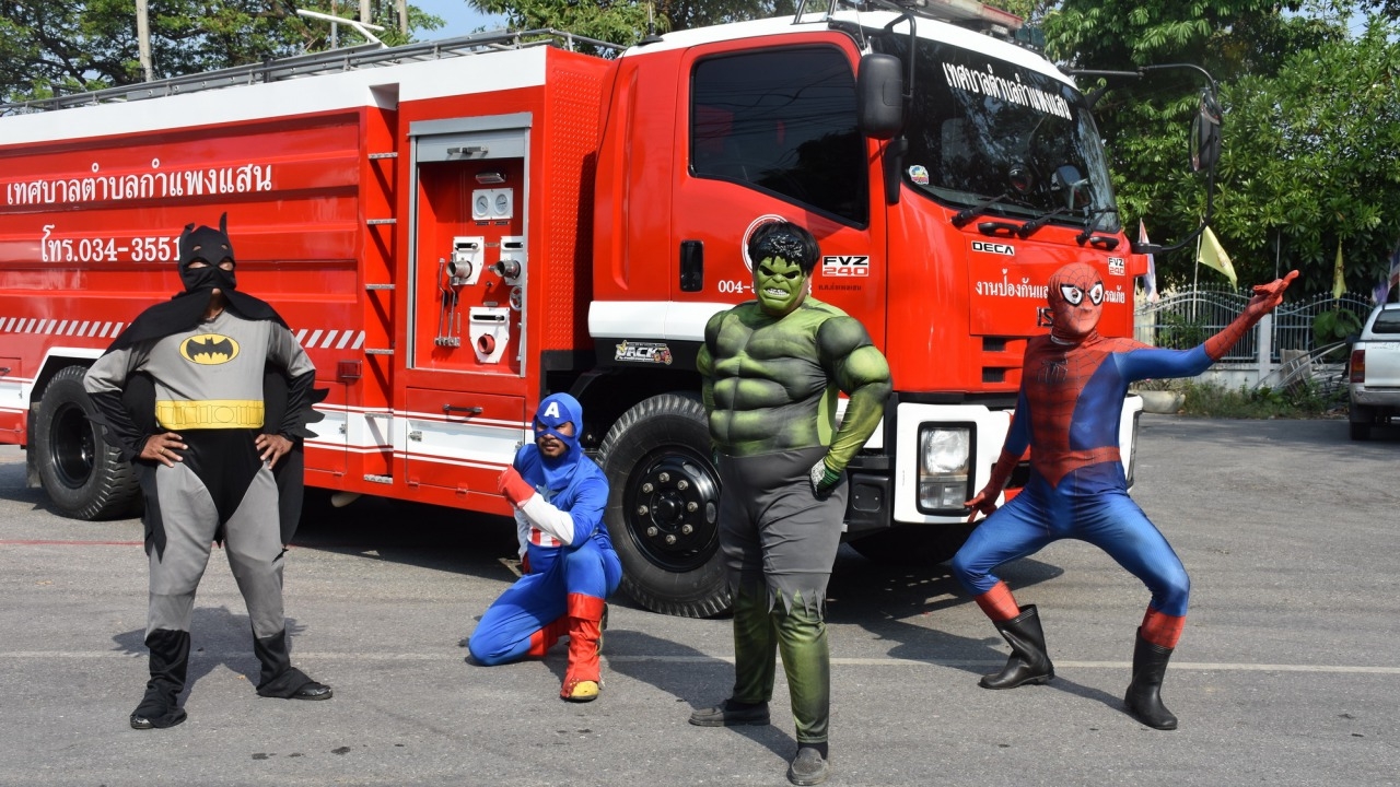 เมื่อวันที่ 25 ก.พ.62 ผู้สื่อข่าวได้รับแจ้งจากชาวบ้าน อ.กำแพงแสน จ.นครปฐม ว่า ชาวบ้านเห็น คนแต่งชุดเหมือนในตัวละครจากภาพยนตร์ สไปเดอร์แมน ฮัลค์ มนุษย์เขียวจอมพลัง กัปตันอเมริกา และแบทแมน ออกปฏิบัติหน้าที่ในการฉีดน้ำดับเพลิงล้างทำความสะอาดถนนอยู่ริมถนนมาลัยแมน ในเขตเทศบาลตำบลกำแพงแสน อ.กำแพงแสน โดยมีรถน้ำดับเพลิงของเทศบาลตำบลกำแพงแสนขับประคองใช้สายยางต่อจากรถดับเพลิงฉีด และกวาดถนน สร้างความฮือฮาให้กับผู้ใช้รถใช้ถนนที่ผ่านไปมาเมื่อเห็น บางรายถึงกับจอดรถและขอจับมือ ชาวบ้านต่างพูดเป็นเสียงเดียวกันว่าท่ามกลางอากาศร้อนเมื่อเห็นการทำหน้าที่ของเหล่าบรรดาฮีโร่ ต่างยิ้มแย้มเหมือนสร้างความสุขลดความร้อนไปได้