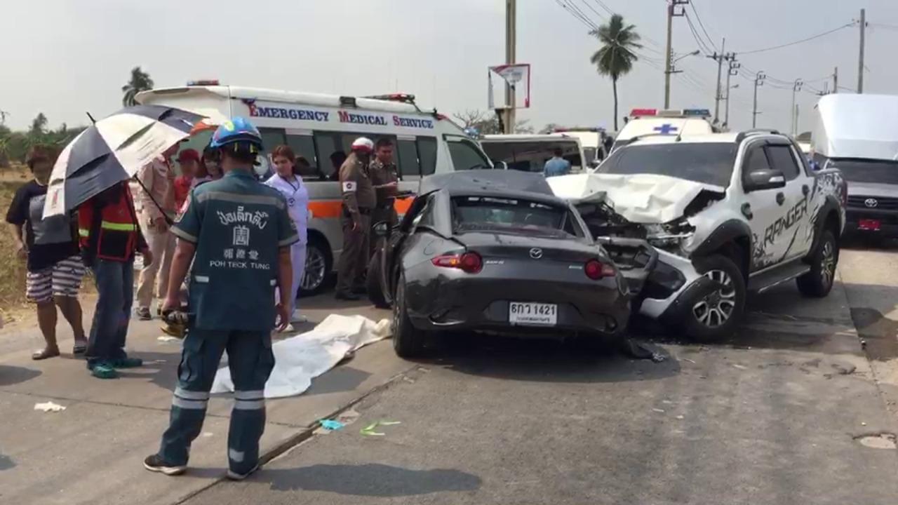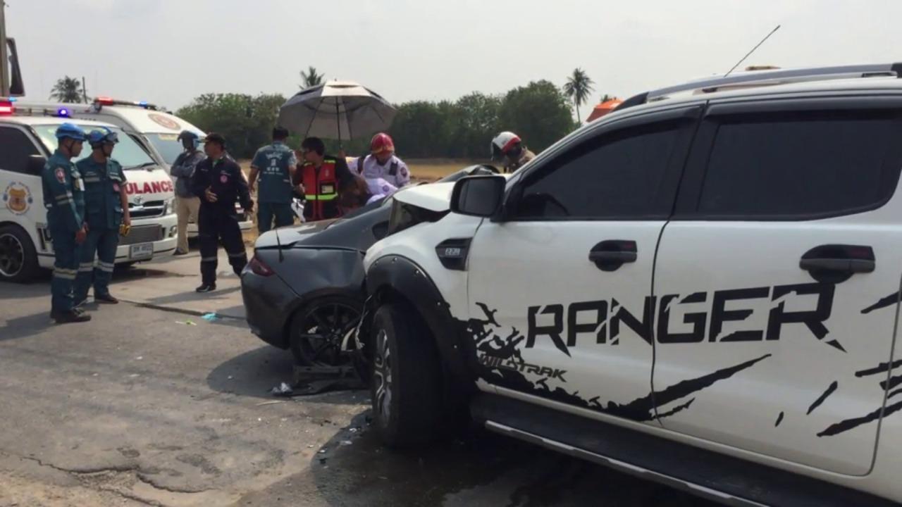 ส่วนรถคู่กรณีเป็นรถยนต์กระบะ ยี่ห้อฟอร์ด รุ่นแรนเจอร์ สีขาว ทะเบียนป้านแดง ย 4245 กรุงเทพมหานคร สภาพด้านหน้าพังยับ มีนายเรืองฤทธิ์ การจริงไพร อายุ 34 ปี เป็นคนขับรถได้รับบาดเจ็บเล็กน้อย