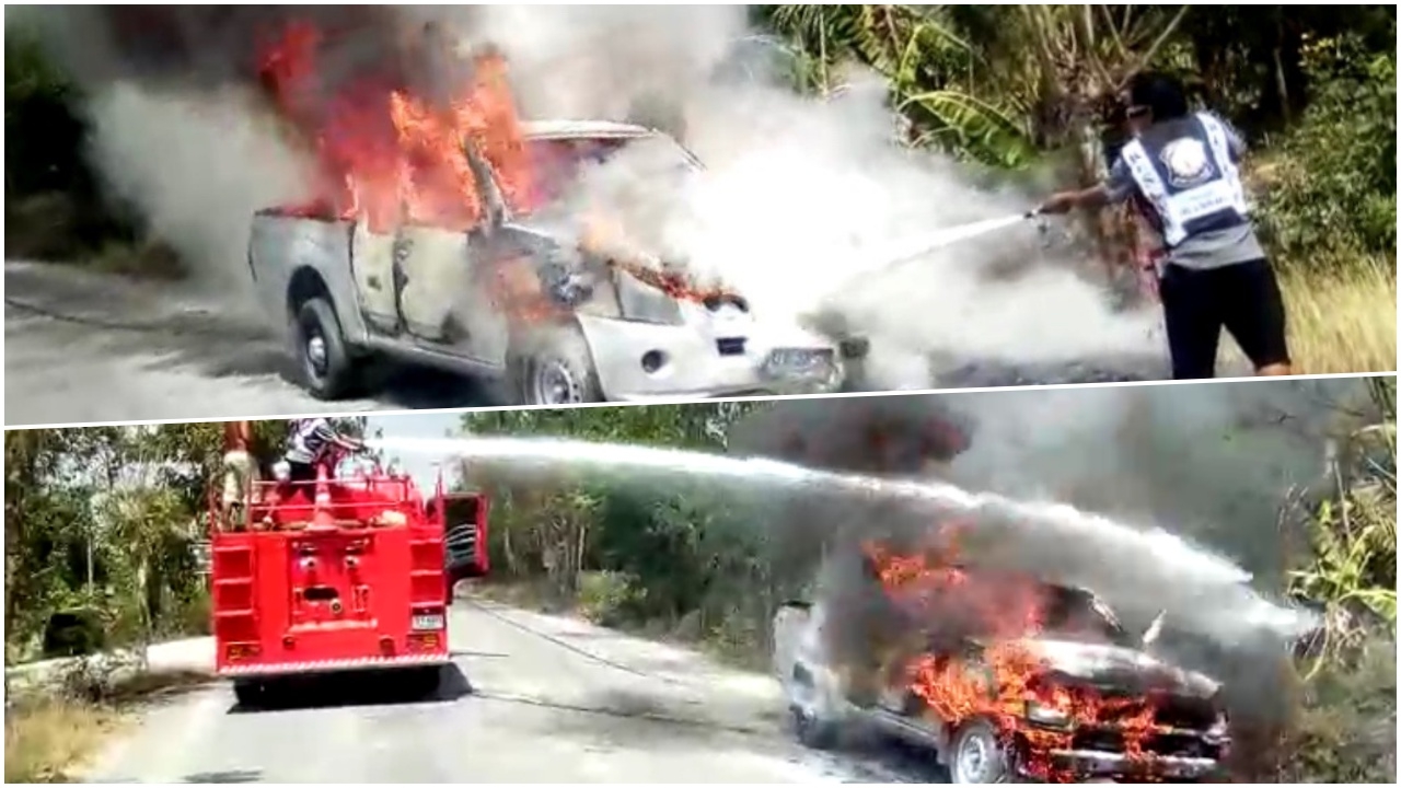นางกรรณิการ์ กลางโฉม อายุ 47 ปี ชาว ต.สระลงเรือ อ.ห้วยกระเจา จ.กาญจนบุรี กล่าวว่า เดินทางมาพร้อมลูกสาว 2 คน เพื่อมาส่งผ้าใน ต.จรเข้สามพัน ขณะจอดรถได้กลิ่นน้ำมัน ซึ่งไม่ได้สนใจ จนเมื่อส่งผ้าเสร็จ รีบเดินทางต่อเพื่อไปหาหลานใน ต.ยุ้งทะลาย โดยขณะเหยียบคลัตช์จะเข้าเกียร์ไม่สามารถทำได้ จากนั้นมีควันพวยพุ่งมาจากห้องเครื่อง จึงรีบบอกให้ลูกๆ ลงจากรถ กระทั่งไฟลุกไหม้อย่างรวดเร็ว จึงรีบโทรแจ้งเจ้าหน้าที่ขอความช่วยเหลือ เบื้องต้นคาดว่าน่าจะเกิดจากสายน้ำมันรั่วไหลภายในห้องเครื่องจนทำให้ไฟลุกไหม้ดังกล่าว.