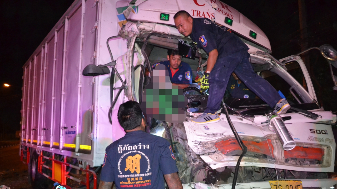 รถหกล้อชนท้ายรถพ่วงห้องโดยสารยับยู่ยี่ คนขับถูกอักก๊อบปี้ติดหน้ารถได้รับบาดเจ็บ บนถนนสายสุวรรณศร ระหว่าง กม.111-112 พื้นที่ อ.บ้านนา จ.นครนายก กู้ภัยต้องเร่งงัดร่างออกมาก่อนนำส่งโรงพยาบาล