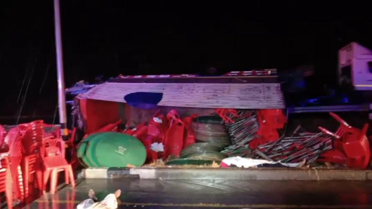 รถหกล้อบรรทุกโต๊ะจีนดังที่นครปฐม กลับจากจัดงานแต่งที่จันทบุรี ฝนตกถนนลื่นเสียหลักพุ่งลงข้างทางริมถนนสาย 304 ที่ อ.เขาหินซ้อน ตายคาที่ 4 ราย บาดเจ็บอีก 5 ราย...